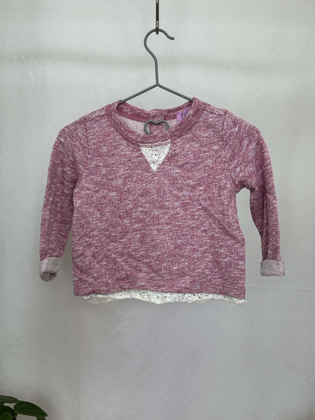 Lehká mikina s dlouhými rukávy v růžovém melírovaném designu. Elegantní krajkový lem na spodní části a krajkový detail u výstřihu přidávají jemnost a šmrnc. Zapínání na dva knoflíky na zadní straně pro snadné oblékání. Ideální pro malé parádnice ve velikosti 80. Vhodná na každodenní nošení i na slavnostnější příležitosti.