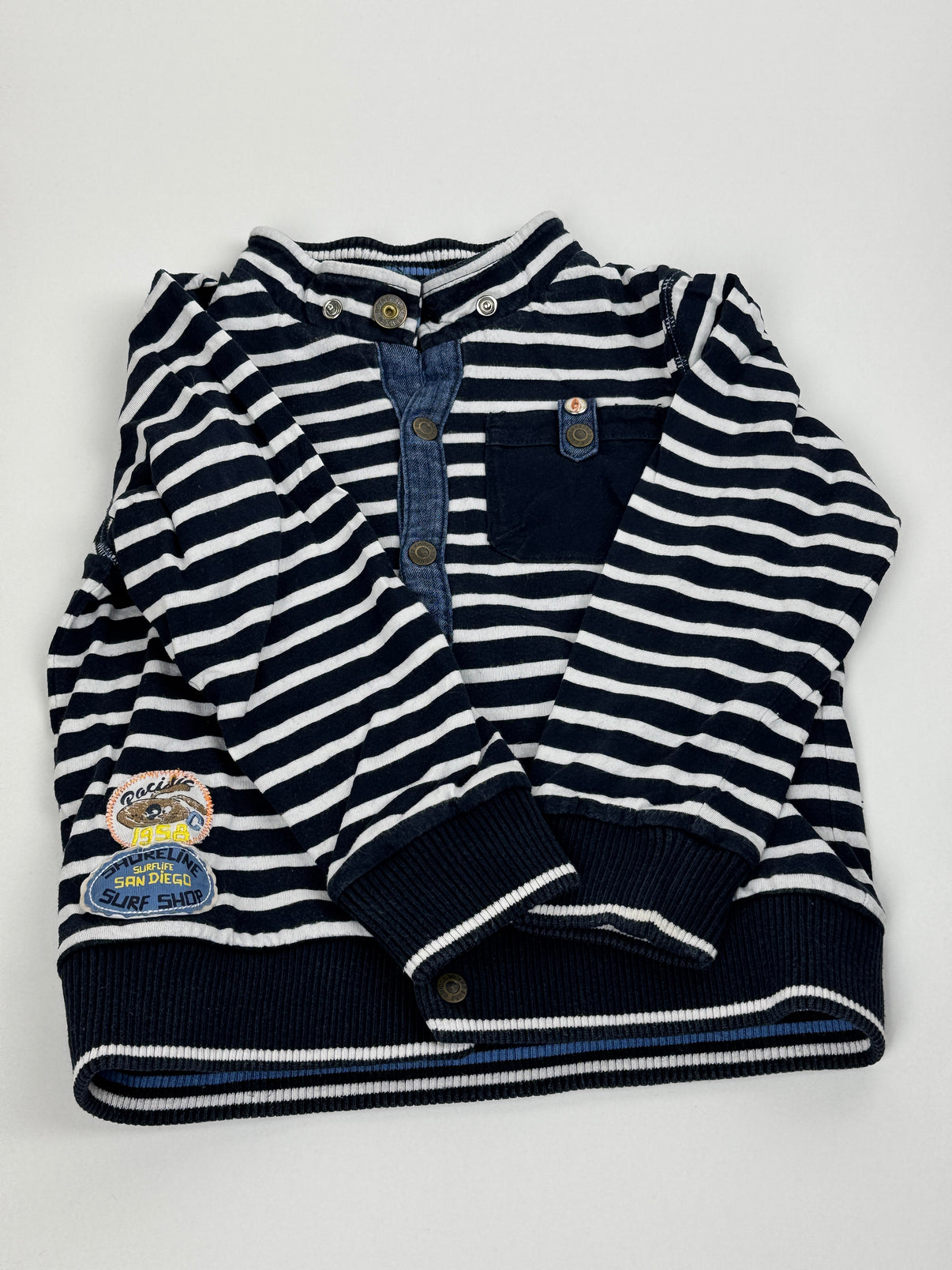 Stylová pruhovaná mikina značky Chicco ve velikosti 92 zaujme tmavě modro-bílým námořnickým designem, který je doplněn džínovými detaily u knoflíkové légy a náprsní kapsy. Výšivky a nášivky s motivem surfařského obchodu „San Diego Surf Shop“ dodávají mikině ležérní kalifornský vibe. Praktické žebrované lemy na rukávech a spodním okraji zajistí pohodlné nošení, ideální pro aktivní kluky na výlety, do školky i na hřiště. Skvělý kousek pro malé objevitele s láskou k moři a dobrodružství!