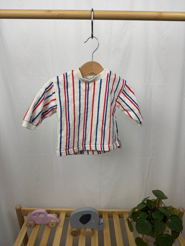 Pruhovaná mikina značky H&M ve velikosti 68 přináší hravý a stylový vzhled pro vaše děťátko. Bílý základ s červenými a modrými proužky vytváří veselý design, který se snadno kombinuje s dalšími kousky oblečení. Mikina je vyrobena z příjemného materiálu, který je pohodlný na nošení a šetrný k dětské pokožce. Praktický střih s dlouhými rukávy a zapínáním u krku usnadňuje oblékání. Perfektní volba na procházky, do kočárku i na domácí lenošení.