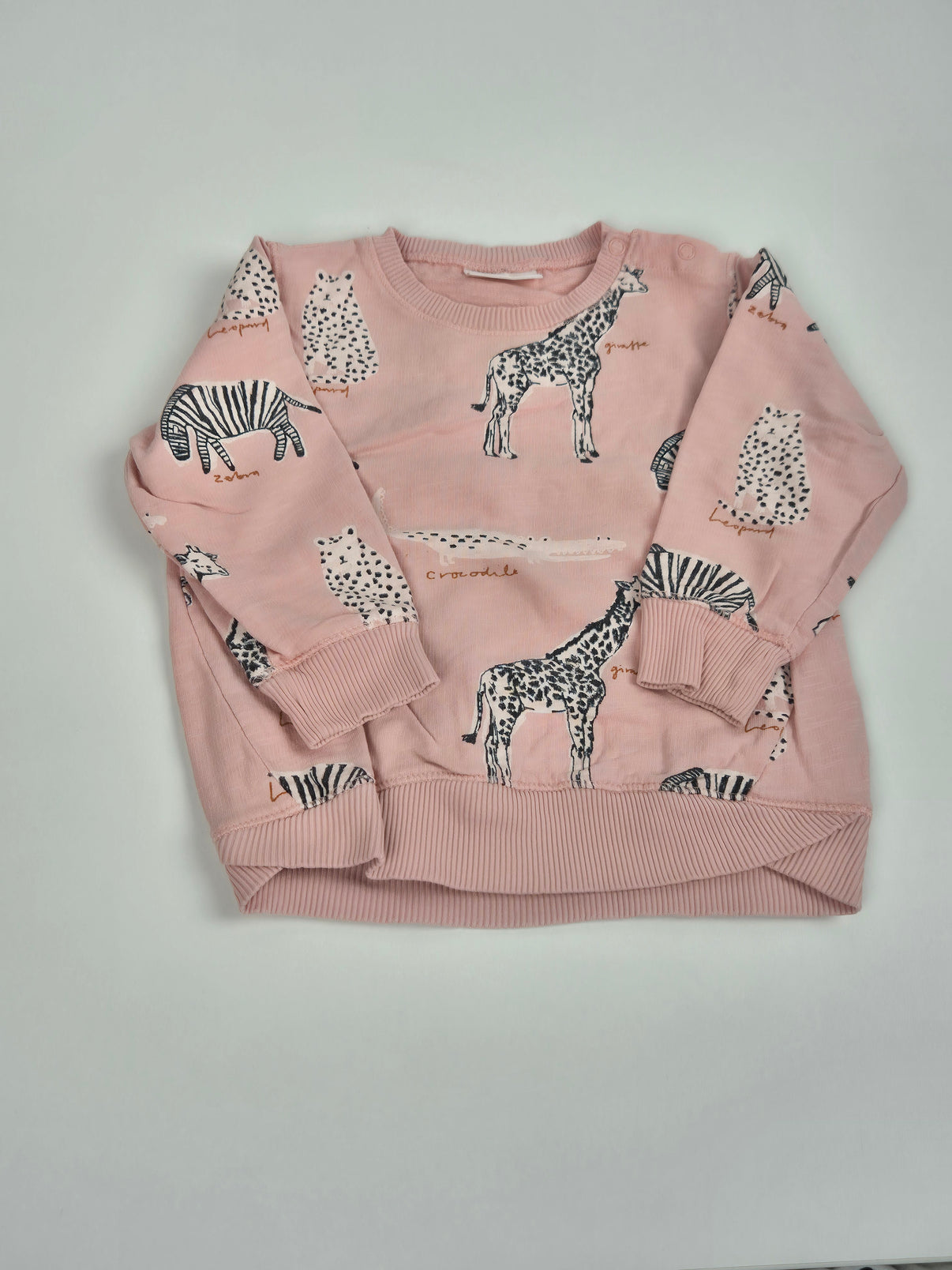Růžová mikina Lindex ve velikosti 86 s kulatým výstřihem a zapínáním na patentky na rameni pro snadné oblékání. Zdobí ji hravý potisk zvířátek – žirafy, zebry, leopardi či krokodýl. Pohodlný střih a příjemný materiál dělají z mikiny ideální kousek na každý den pro malé holčičky.
