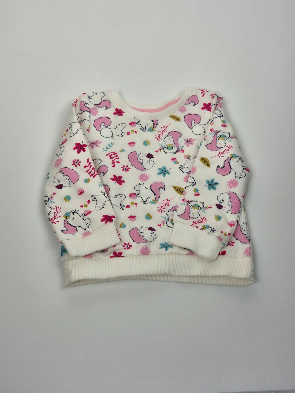 Roztomilá dětská mikina značky Pepco v jemném krémovém odstínu s celoplošným potiskem veverek, květinek a drobných přírodních motivů. Barevnost je laděná do růžových, pastelově modrých a hořčicových tónů, které působí něžně, hravě a velmi holčičkovsky.