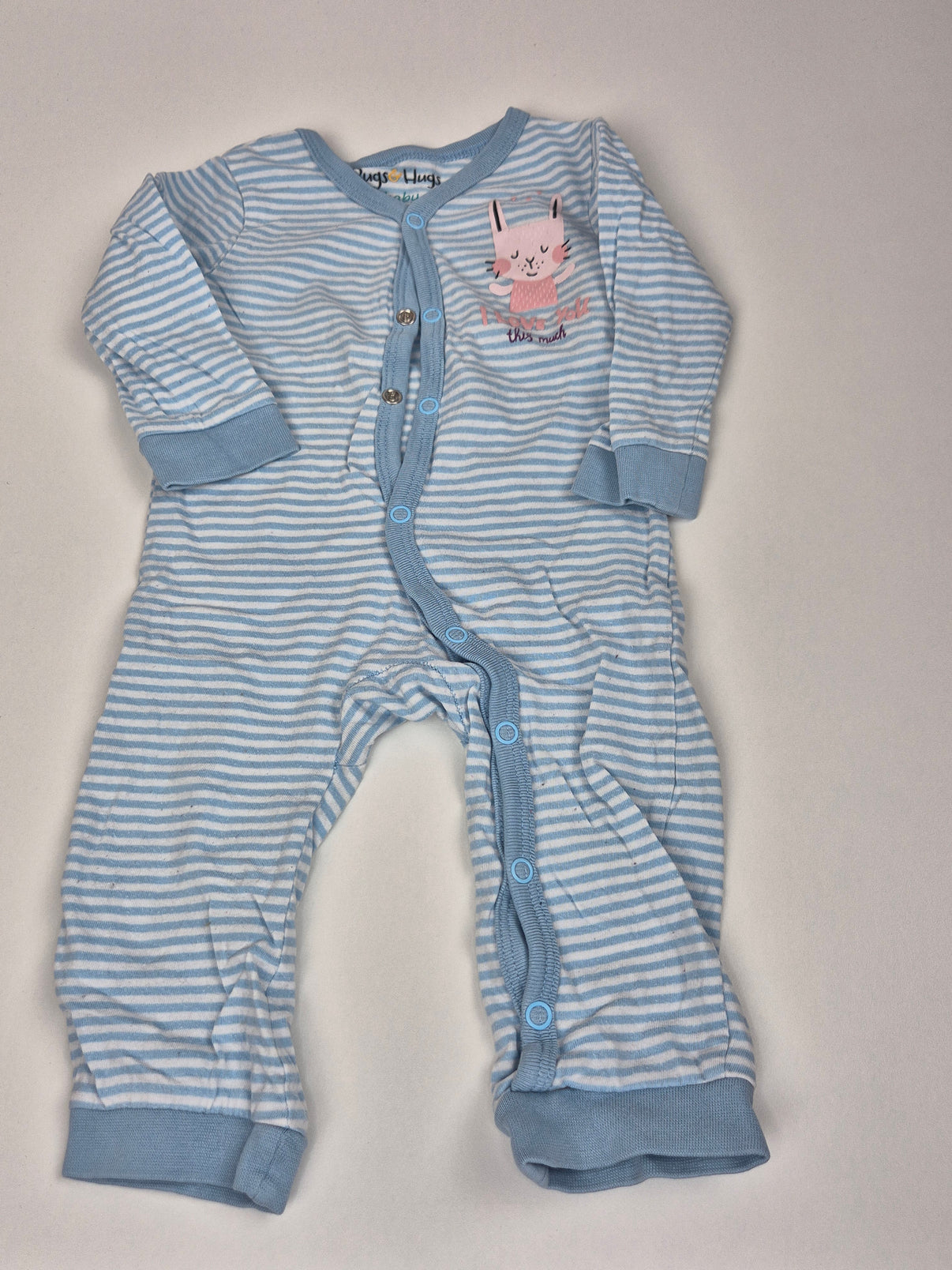 Měkoučký overal na spaní i denní nošení v modrobílém pruhovaném vzoru. Na hrudi má roztomilý obrázek zajíčka s nápisem „Love you this much“. Praktické zapínání na patentky po celé délce...