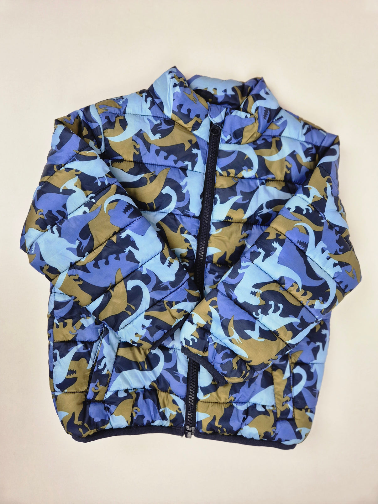 Chlapecká přechodová bunda značky Lupilu ve velikosti 92 s výrazným potiskem dinosaurů v odstínech modré a khaki. Bunda má zapínání na zip, dvě kapsy na přední straně a je lehká, přesto hřejivá. Perfektní na jarní a podzimní dny i na výlety ven.