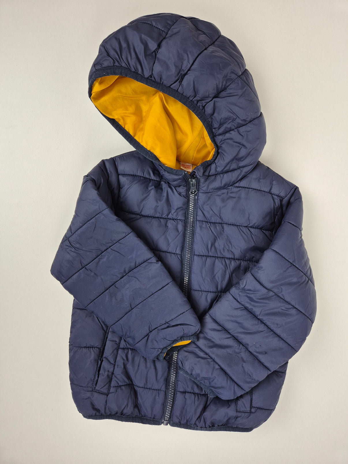 Dětská přechodová bunda značky Lupilu ve velikosti 98 v tmavě modré barvě s kontrastní žlutou podšívkou. Bunda má praktickou kapuci, zapínání na zip a dvě kapsy na přední straně. Je lehká, ale přitom příjemně zahřeje, ideální na jaro a podzim.