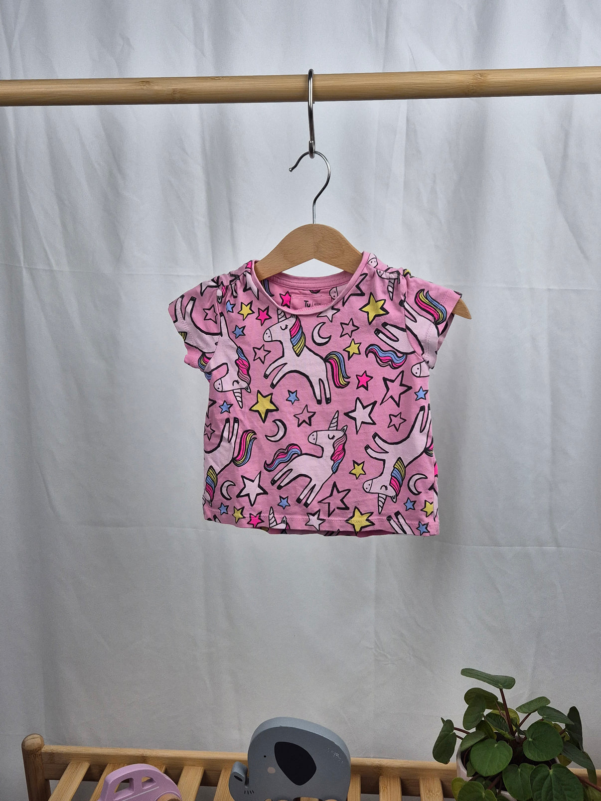 Růžové tričko s krátkým rukávem s jednorožci Tu 74/80