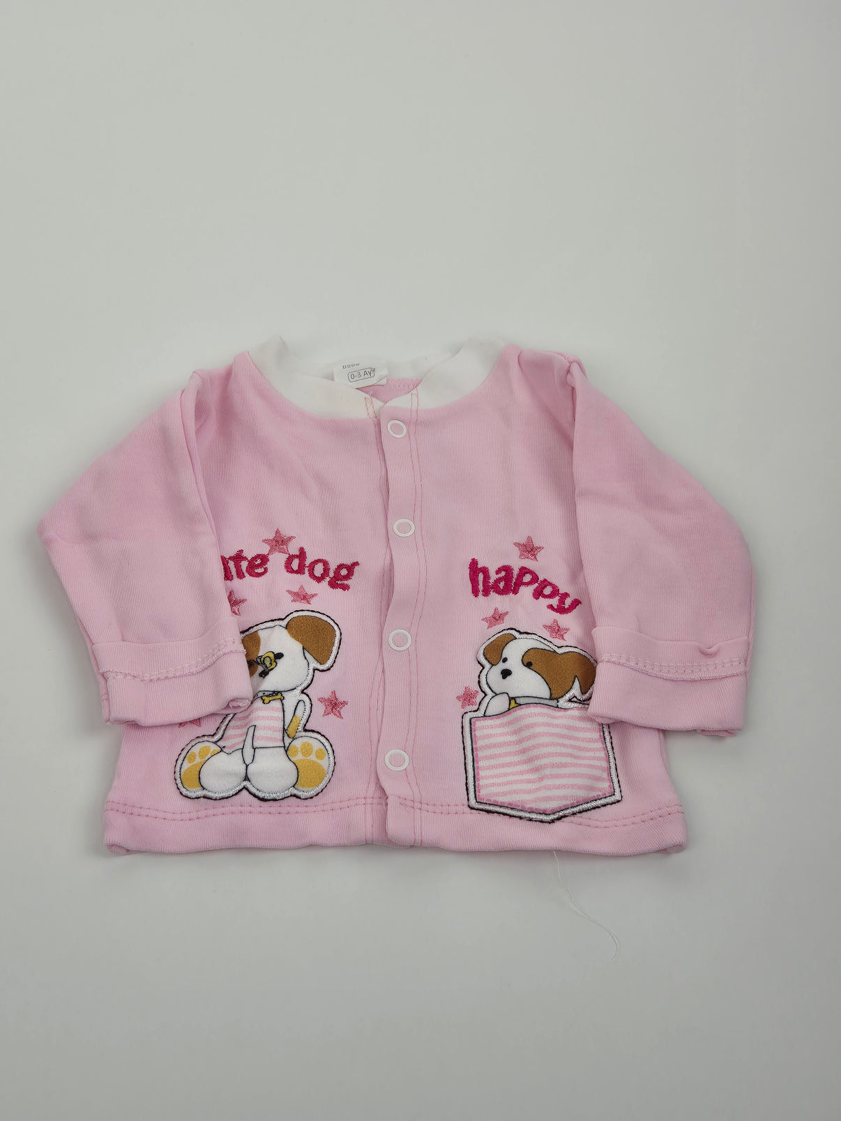 Roztomilý růžový kabátek s pejsky je ideálním kouskem pro malé princezny do chladnějších dnů. Měkký bavlněný materiál zajistí miminku pohodlí, zatímco výšivky veselých pejsků s nápisy „cute dog“ a „happy“ dodávají kabátku hravý vzhled. Praktické zapínání na druky po celé délce usnadňuje oblékání. Díky neutrálnímu střihu je skvělým doplňkem k body nebo dupačkám pro pohodlný a stylový outfit.