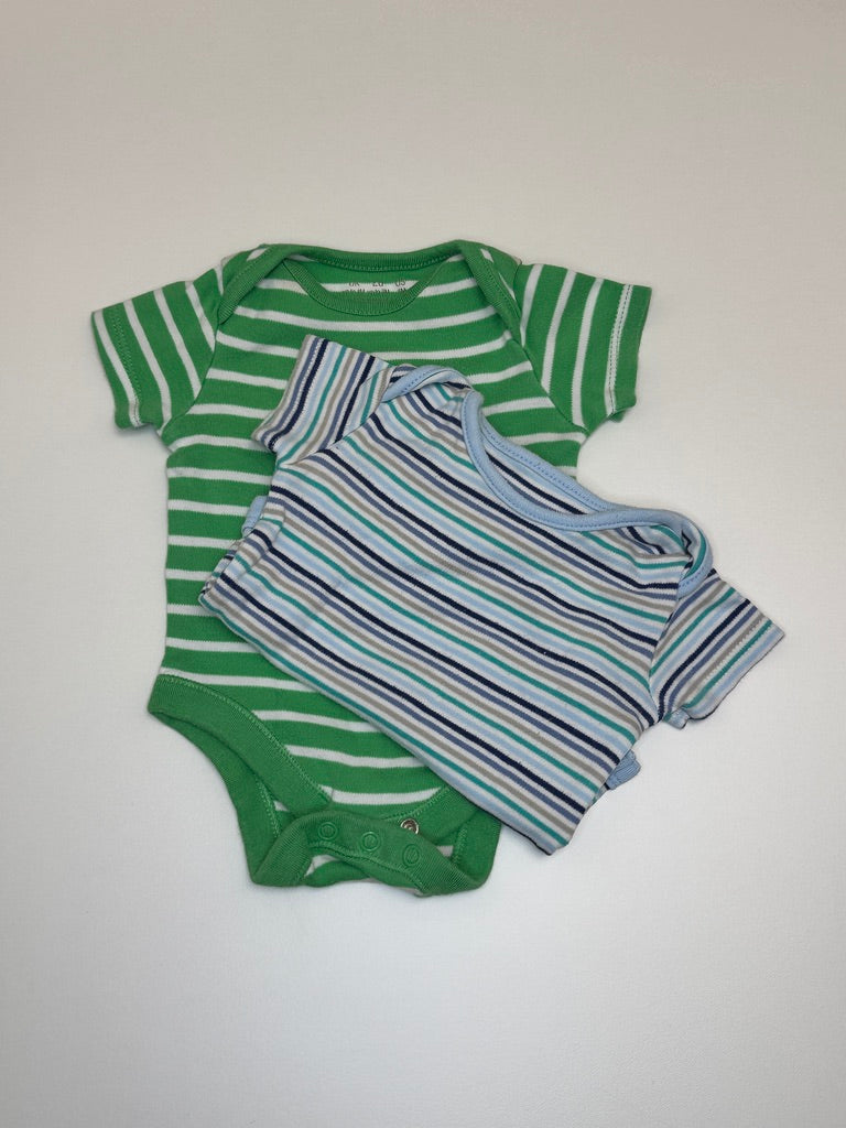 Sada dvou body s krátkým rukávem značky F&F ve velikosti 62, ideální pro miminka. První body je v kombinaci zelené a bílé barvy s klasickým pruhovaným vzorem, druhé body má jemné modré, béžové a šedé proužky, které vytváří moderní a svěží vzhled. Obě body jsou vyrobena z měkkého materiálu, který je šetrný k citlivé pokožce dítěte a zajišťuje pohodlí po celý den. Praktické zapínání mezi nožičkami usnadňuje přebalování.