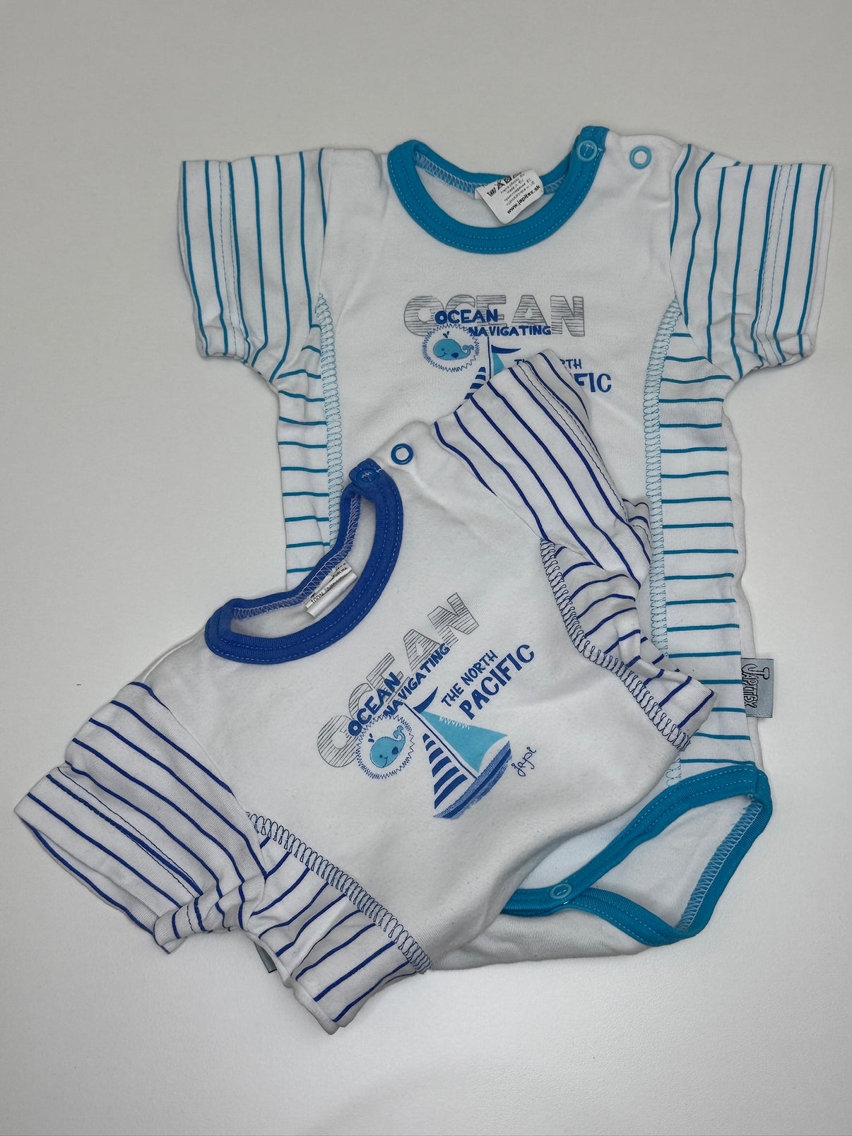 Sada dvou body s krátkým rukávem od značky Japitex ve velikosti 74. Oba kousky mají námořnický motiv s modrými pruhy a potiskem s nápisem „Ocean Navigating The North Pacific“, který evokuje dobrodružství na moři. Jedno body má světle modré lemování, druhé tmavě modré, což dodává rozmanitost této sadě. Praktické zapínání na rameni a ve spodní části zajišťuje snadné oblékání a přebalování. Vyrobeno z měkkého a prodyšného materiálu, který je šetrný k citlivé dětské pokožce. Ideální volba pro malé průzkumníky, kteří milují hravé a tematické oblečení.