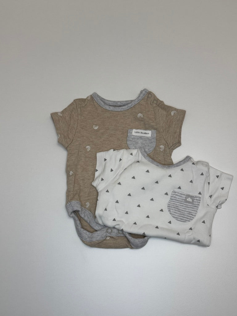 Sada dvou body s krátkým rukávem značky Next Baby ve velikosti 50, ideální pro novorozence. První body je v jemném béžovém odstínu s roztomilými bílými obloučky a šedými detaily, které dodávají celkovému vzhledu roztomilý a hravý prvek. Druhé body je bílé s drobným trojúhelníkovým vzorem a kapsičkou na hrudi, což působí moderně a stylově. Obě body jsou vyrobena z příjemného a měkkého materiálu, který poskytuje komfort a pohodlí pro citlivou pokožku miminka. Praktické zapínání na rameni a mezi nožičkami usnadňuje oblékání a přebalování. Skvělá volba pro nejmenší!