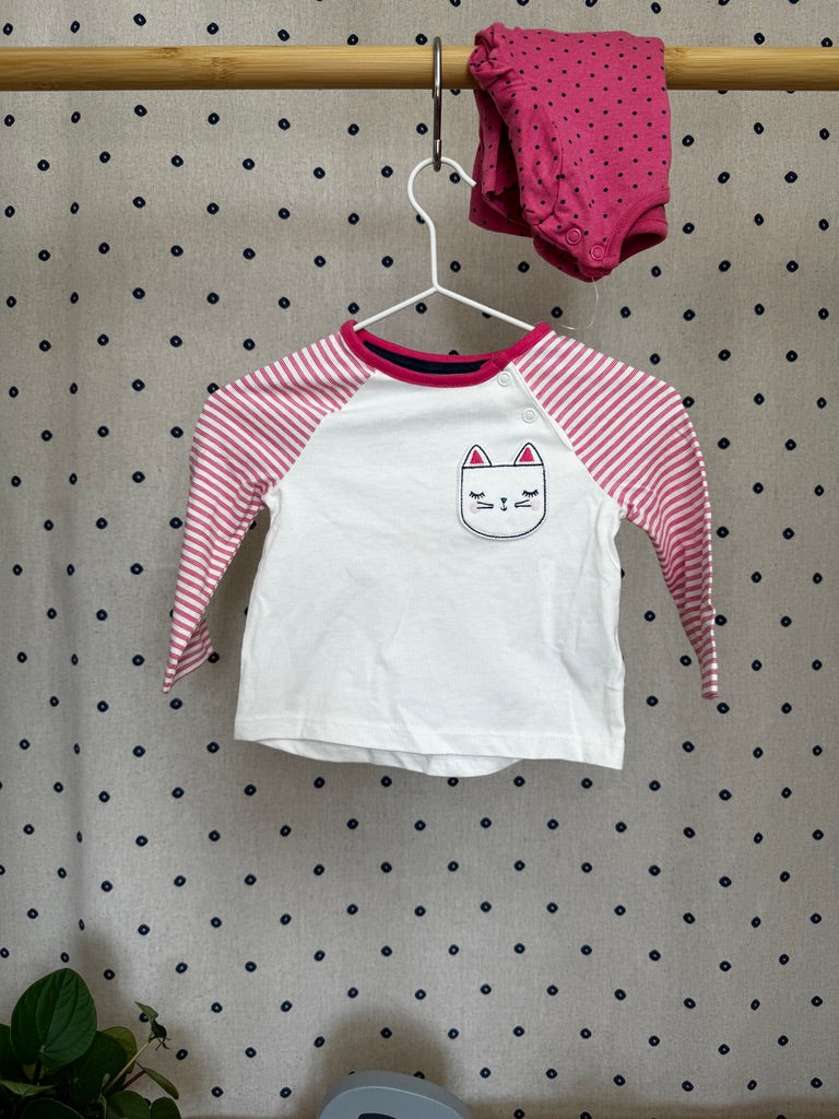 Roztomilá sada dvou triček s dlouhým rukávem značky F&F ve velikosti 68 je perfektní volbou pro malé holčičky. První tričko je bílé s růžovými pruhovanými rukávy a výšivkou usměvavé kočičky...