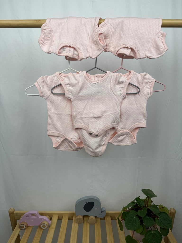 Sada pěti body s krátkým rukávem značky Next ve velikosti 50 je ideální volbou pro novorozence. V jemném růžovém provedení s elegantními detaily, jako je drobný vzor a roztomilé mašličky, působí tato body něžně a stylově. Vyrobena z měkkého a prodyšného materiálu, který je šetrný k citlivé pokožce miminka. Praktické zapínání na patentky mezi nožičkami zajišťuje snadné přebalování a oblékání. Tato sada je skvělá volba pro každodenní nošení doma, do kočárku i na první návštěvy. Perfektní kombinace pohodlí a roztomilého vzhledu pro malou princeznu.