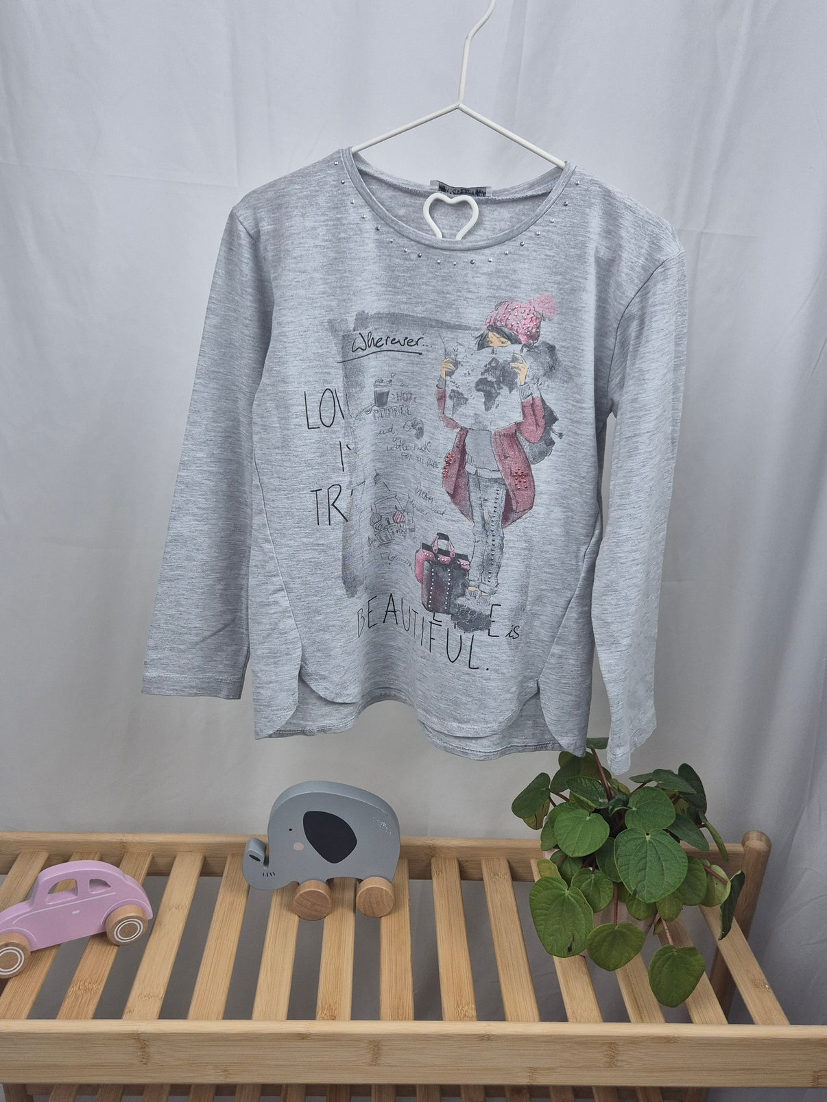 Stylové šedé tričko s dlouhým rukávem od značky Mayoral, zdobené originálním potiskem dívky s mapou a cestovatelskými motivy. Jemné kamínky u výstřihu dodávají tričku elegantní nádech. Pohodlný střih a příjemný materiál zajistí maximální komfort při nošení. Ideální volba pro holky, které rády objevují svět a mají smysl pro styl. Skvěle se hodí na běžné nošení do školy, na výlety i volný čas. Snadno kombinovatelné s džíny, legínami nebo sukní.