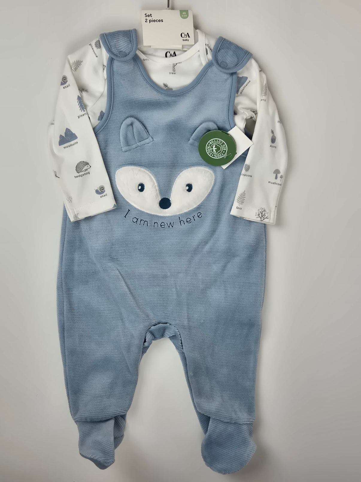 Roztomilý set body s dlouhým rukávem a dupaček C&A Baby ve světle modré barvě s motivem lištičky a nápisem I am new here. Vyrobený z příjemného měkkého materiálu, který je šetrný k dětské pokožce. Dupačky mají praktické zapínání na ramínkách i mezi nožičkami, body s potiskem přírody se snadno obléká díky pružnému výstřihu.