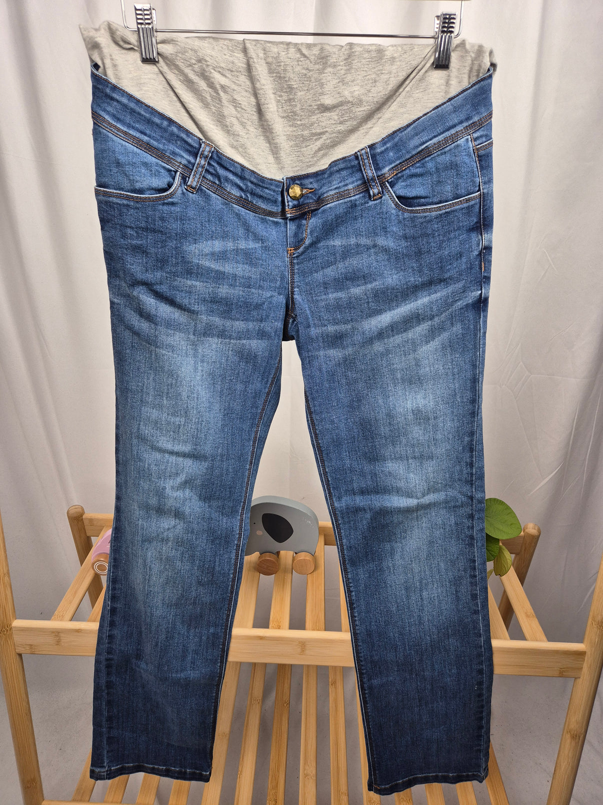 Těhotenské džíny v klasickém modrém denimu s rovným střihem nohavic a pohodlným žebrovaným lemem z šedého úpletu, který se příjemně přizpůsobí rostoucímu bříšku. Džíny mají funkční kapsy vepředu i vzadu, decentní vyšisování a zapínání na knoflík. Skvělé na běžné nošení, do města i na procházky – ideální kombinace stylu a pohodlí během těhotenství.