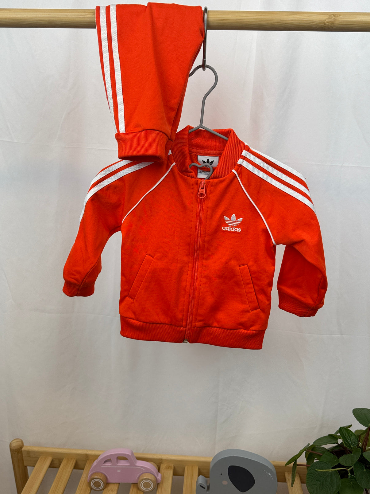 Klasická dětská tepláková souprava Adidas v živé červené barvě s ikonickými bílými pruhy na rukávech a nohavicích. Tato stylová souprava je vyrobena s důrazem na pohodlí a volnost pohybu, ideální pro aktivní chvíle malých sportovců. Zipová bunda s límečkem a elastické kalhoty dodávají outfitu sportovní vzhled, který je zároveň praktický a pohodlný na celodenní nošení. Skvělá volba pro chlapce i dívky, kteří chtějí vyniknout v klasickém sportovním stylu značky Adidas. Velikost 74, ideální pro malé děti.