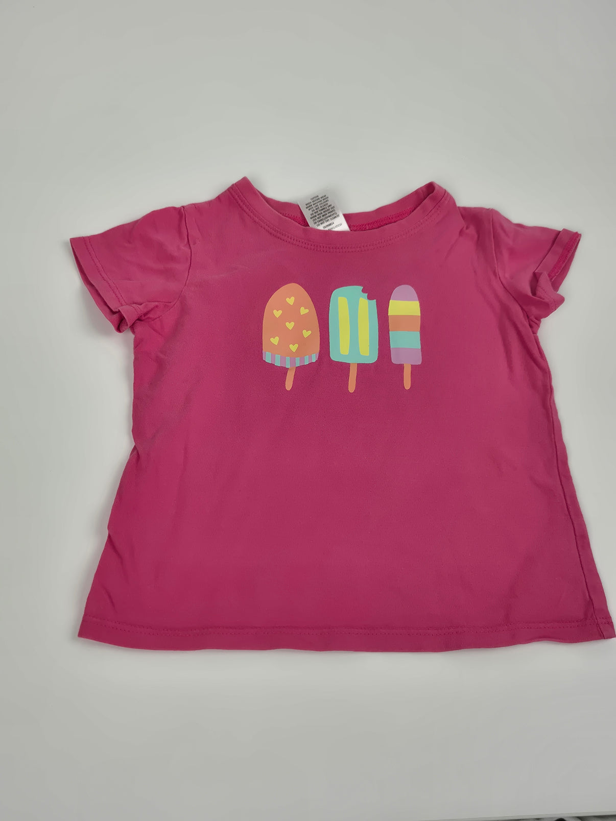 Růžové tričko s krátkým rukávem ve velikosti 92 ozdobené veselým potiskem tří nanuků v pestrých barvách. Lehký bavlněný materiál je příjemný na nošení a skvěle se hodí na léto i jako základní kousek do šatníku pro malé holčičky.