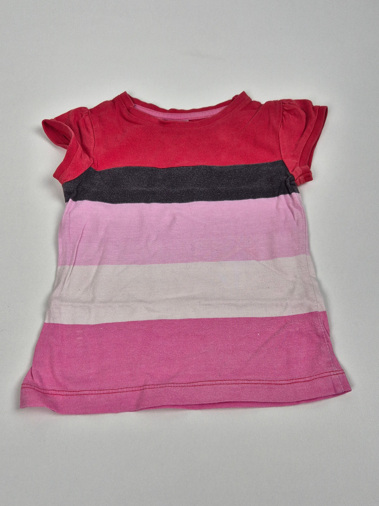 Dívčí tričko značky C&A, velikost 92, se zajímavým pruhovaným designem v odstínech červené, růžové, světle růžové a černé. Má krátké rukávy s jemným nařasením, což dodává tričku hravý a roztomilý...