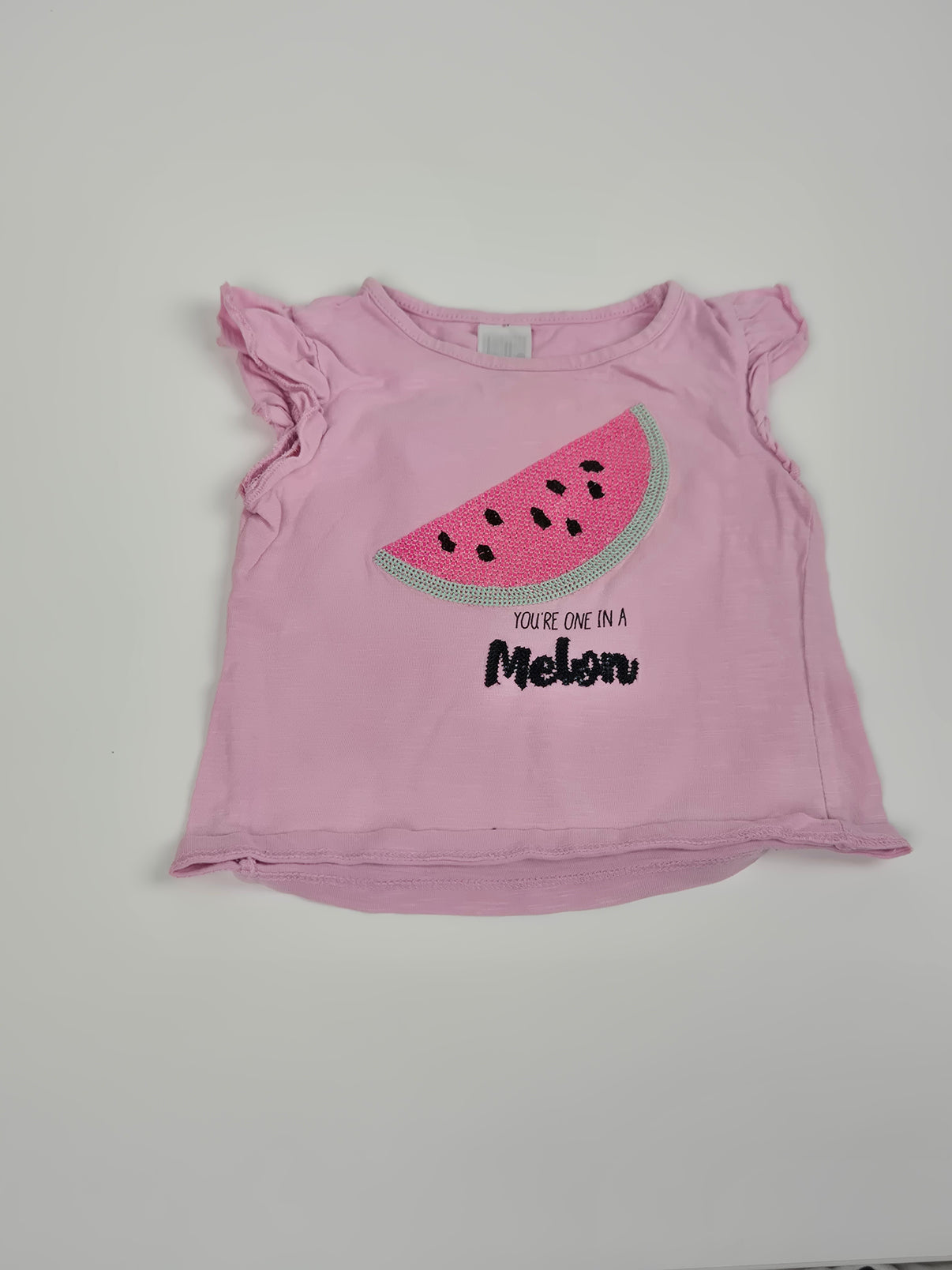 Růžové tričko C&A ve velikosti 92 s krátkým rukávem, volánky na ramenou a veselou aplikací melounu z flitrů s nápisem „You’re one in a Melon“. Lehký materiál je ideální na...
