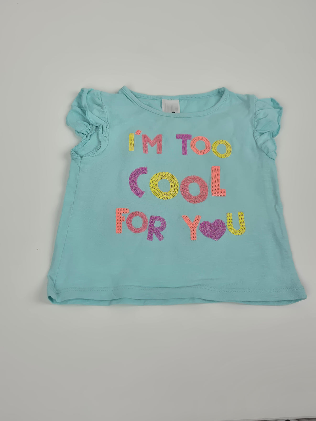 Světle modré tričko C&A ve velikosti 98 s krátkým rukávem a jemnými volánky na ramenou. Přední stranu zdobí barevný nápis „I’m too cool for you“ s třpytivými detaily. Lehký bavlněný materiál je ideální na léto pro malé holčičky.