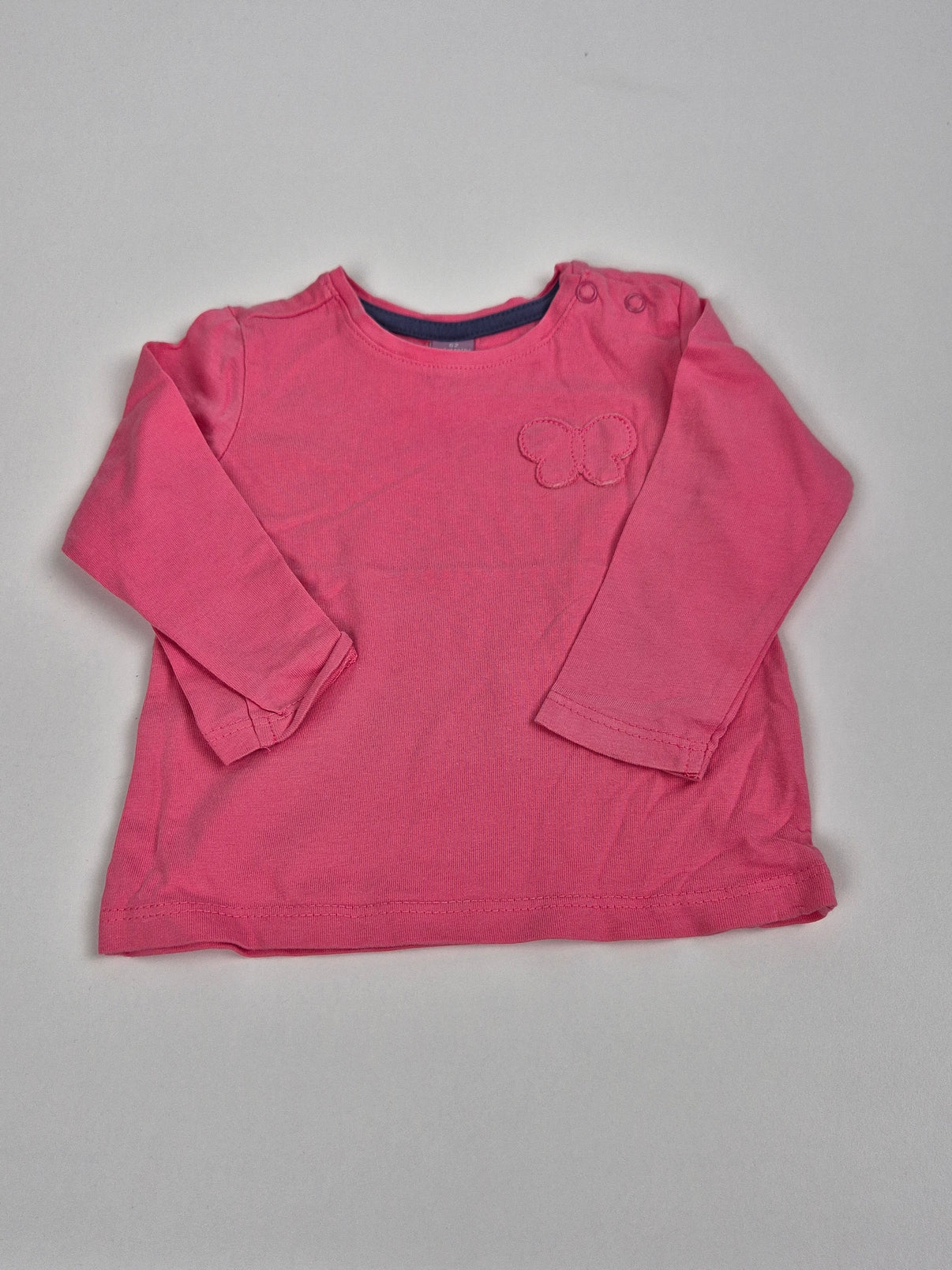 Růžové tričko Dopodopo ve velikosti 62 má dlouhý rukáv a zapínání na patentky u ramínka pro snadné oblékání. Na hrudi ho zdobí jemná aplikace motýlka v tónu látky. Pohodlný kousek na každý den pro malé holčičky.