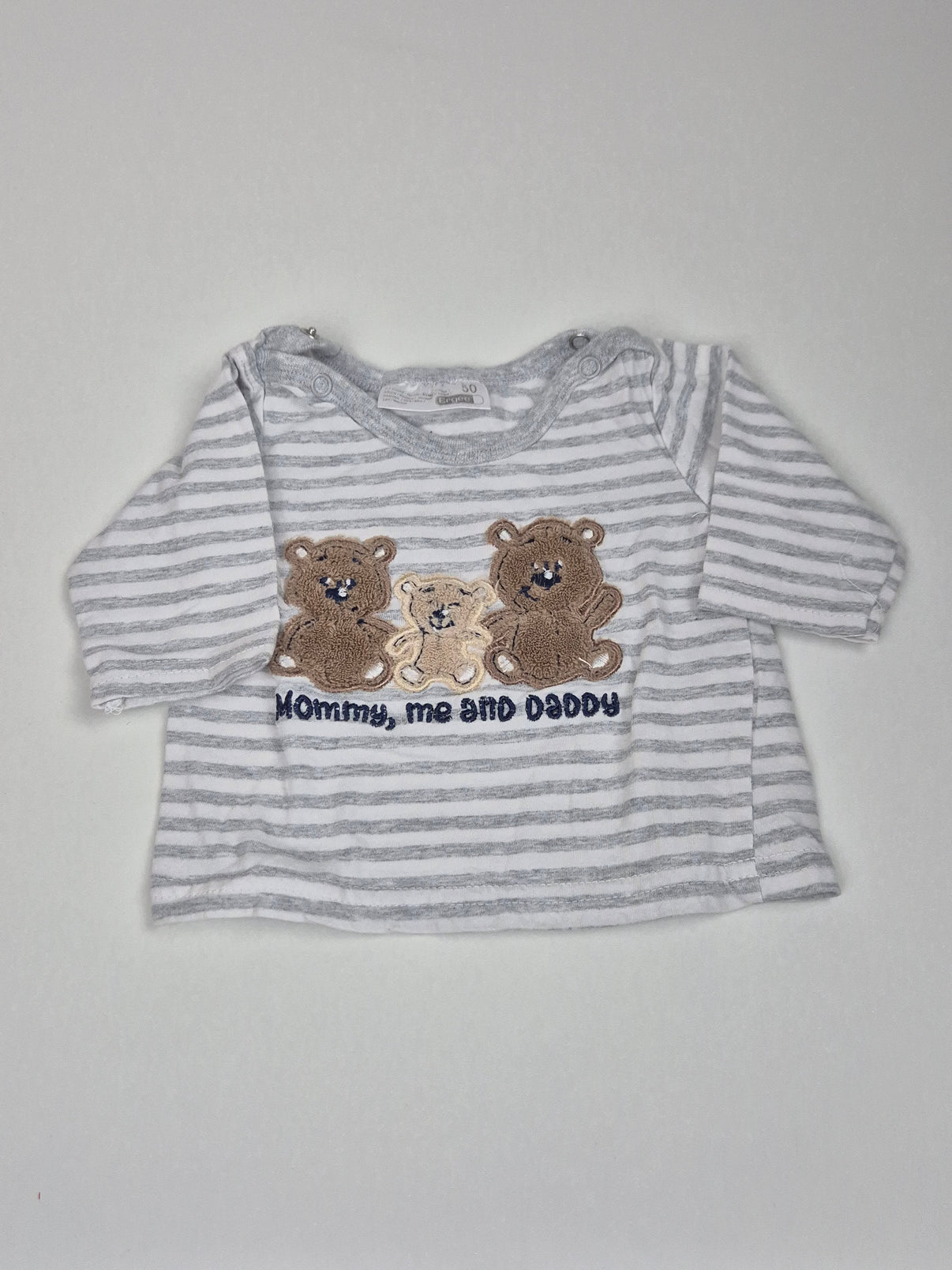 Tohle roztomilé tričko značky Ergee ve velikosti 50 je v bílo-šedém pruhovaném provedení a zdobí ho výšivka tří medvídků s nápisem Mommy, me and Daddy. Díky praktickému zapínání na ramínku se snadno obléká a je ideální pro nejmenší miminka – ať už na doma nebo na první procházky.