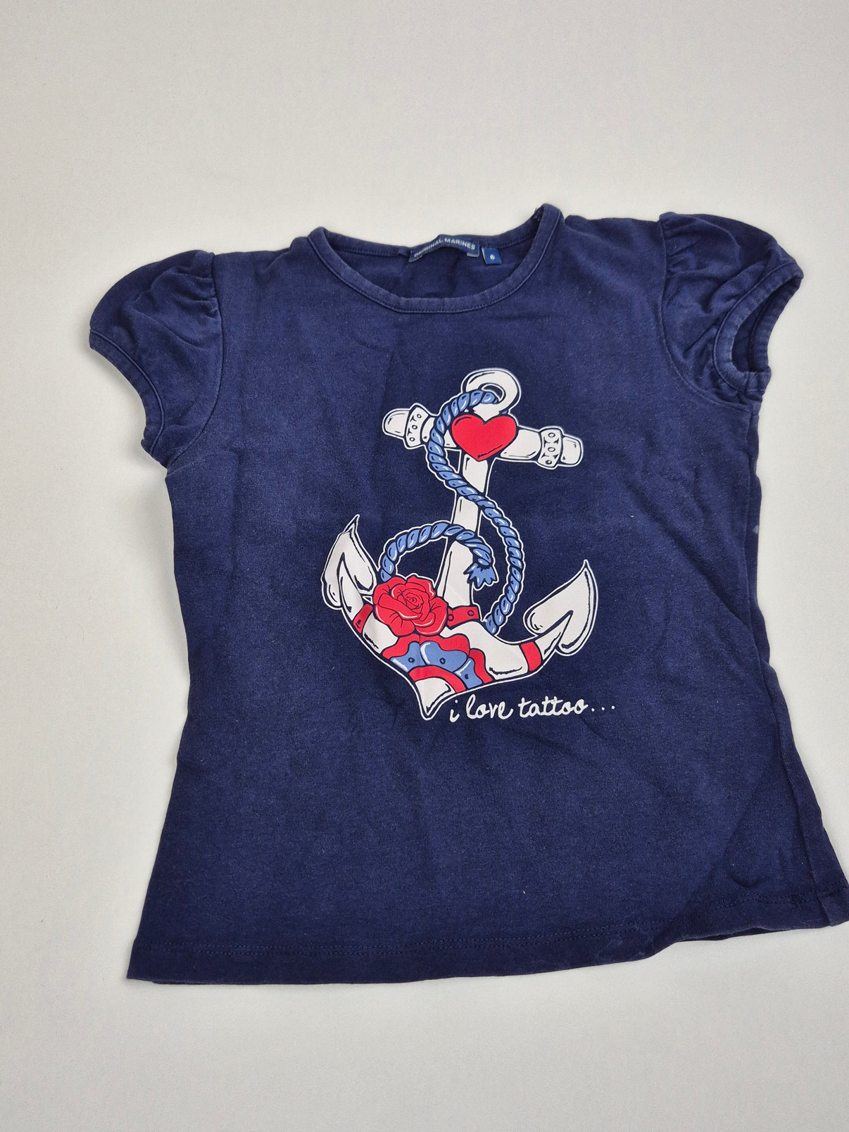 Tmavě námořnicky modré tričko s krátkým rukávem značky Original Marines v klasickém, lehce sepraném odstínu. Přední stranu zdobí výrazný námořnický motiv kotvy s červenými detaily a nápisem I love tattoo…, který dodává tričku stylový a trochu rebelsky hravý vzhled. Jemně nabírané rukávy působí holčičím dojmem, střih je ale stále pohodlný na běžné nošení. Skvělá volba do školy, na volný čas i letní dny. Kousek vhodný především pro holčičku.