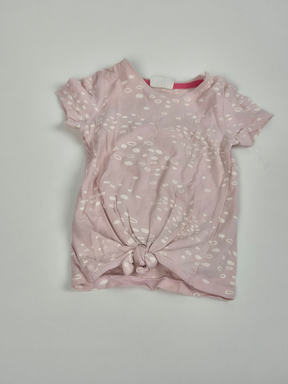 Růžové tričko Pepco s krátkým rukávem a bílým vzorem působí jemně a roztomile. Zajímavým detailem je uzlík v přední části, který dodává tričku hravý a moderní vzhled. Vyrobeno z lehkého bavlněného materiálu, ideální na teplejší dny nebo pod mikinu. Velikost 86, vhodné pro holčičky.