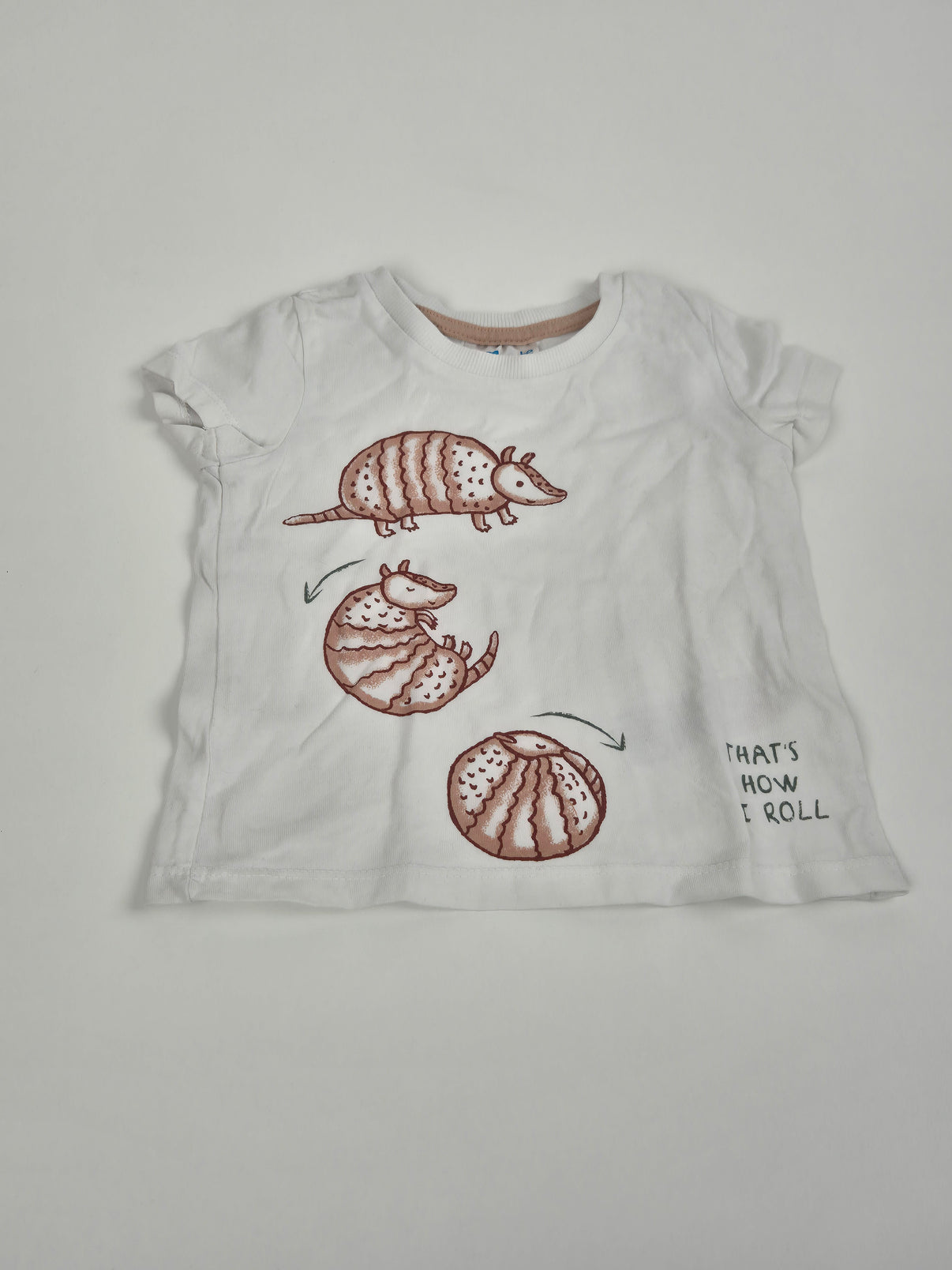 Bílé tričko Pepco s krátkým rukávem a veselým potiskem pásovce, který se kutálí do kuličky. Obrázek doplňuje nápis „That’s how I roll“, který dodává tričku hravý vzhled. Příjemný bavlněný materiál zajistí pohodlí na běžné nošení i hraní. Velikost 74, vhodné pro kluky i holčičky.