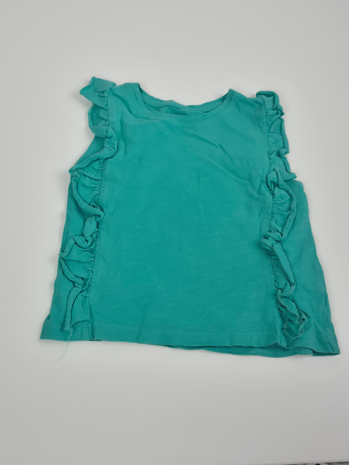 Tyrkysové tričko Reserved ve velikosti 104 má volnější střih a zdobí ho jemné volánky po stranách i na ramenou. Je vyrobené z příjemného materiálu a skvěle se hodí na každodenní nošení, do školky i na hřiště. Kousek je určený pro holčičky.