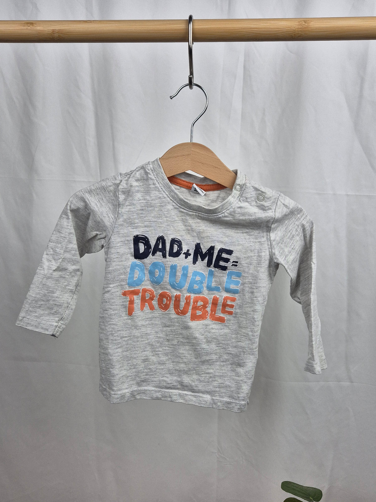 Dětské tričko s dlouhým rukávem značky Dopodopo ve velikosti 80. Světle šedé tričko s vtipným nápisem „DAD + ME = DOUBLE TROUBLE“ v modro-oranžové barevné kombinaci dodává hravý a moderní...