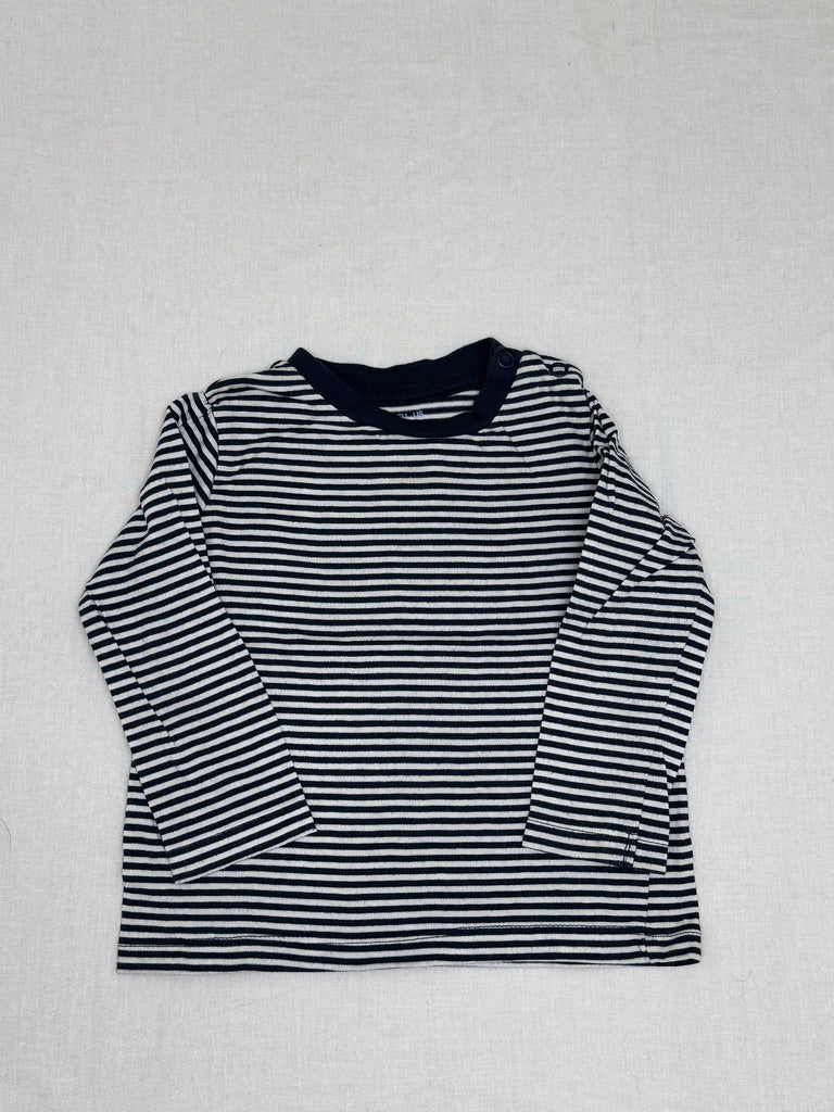 Pruhované tričko s dlouhým rukávem v černobílé kombinaci od značky Primark ve velikosti 74. Skvělé pro chlapečky, ideální na každodenní nošení. Jednoduchý design doplněný praktickým zapínáním na rameni pro snadné oblékání.