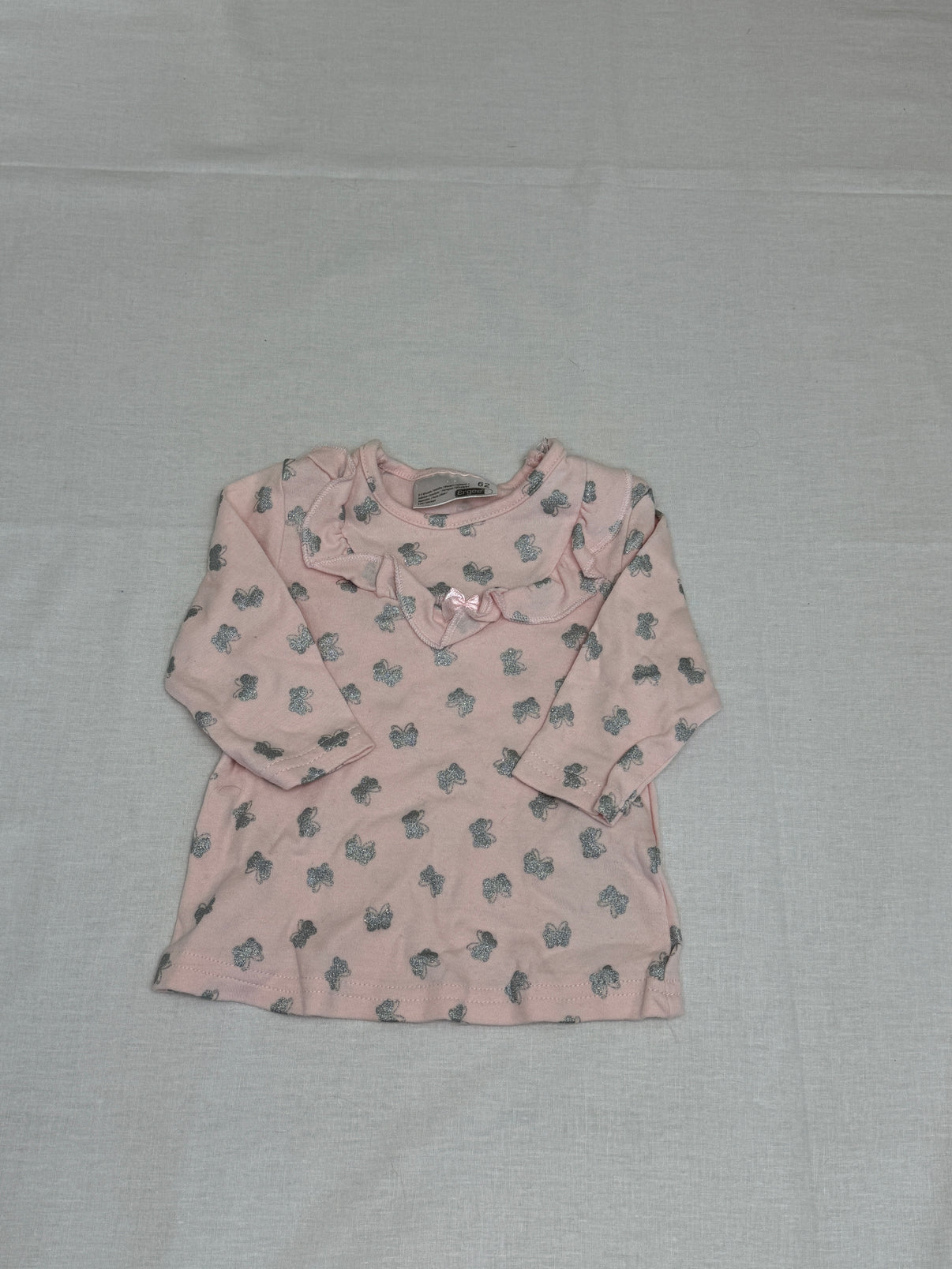 Roztomilé tričko s dlouhým rukávem od značky Ergee ve velikosti 62. Tričko je v jemně růžové barvě s potiskem stříbrných motýlků, které dodávají něžný a elegantní vzhled. Na přední straně je volánek kolem výstřihu doplněný malou růžovou mašličkou, což přidává tričku hravý detail. Vyrobeno z měkkého a pohodlného materiálu, který je ideální pro každodenní nošení a šetrný k citlivé dětské pokožce. Perfektní volba pro malé princezny, která se skvěle hodí k legínám nebo kalhotkám.