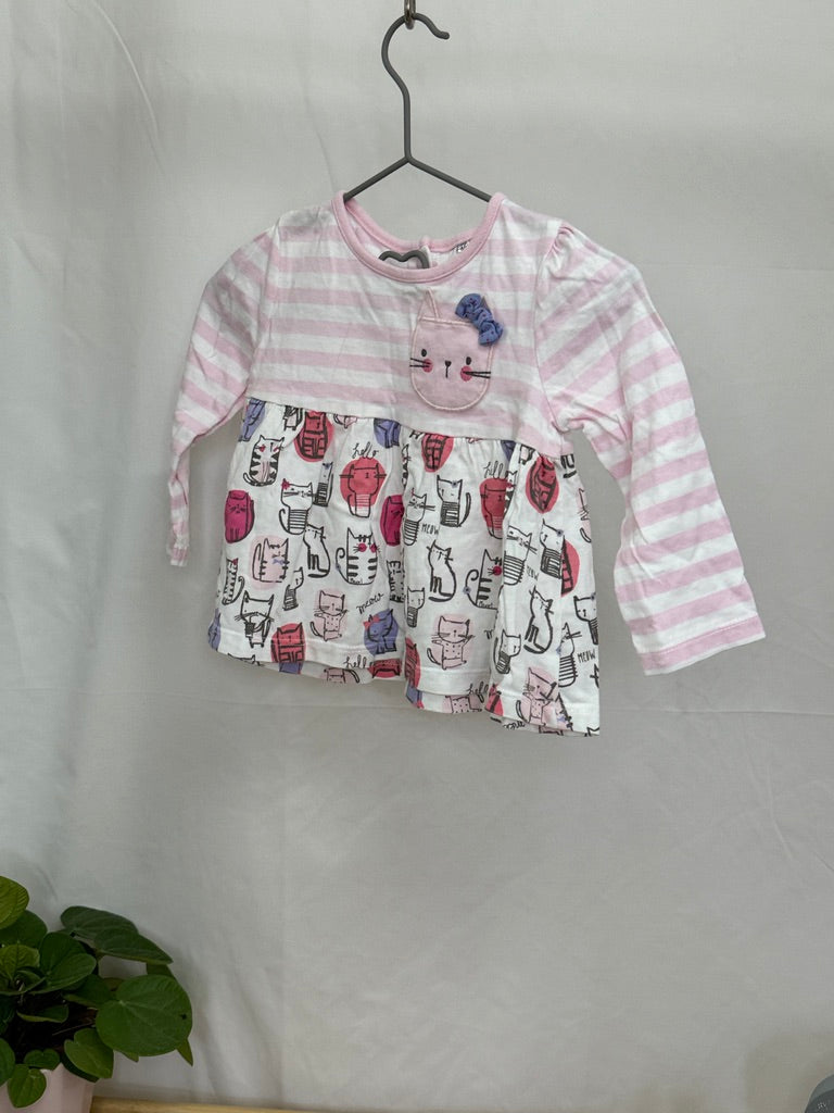 Roztomilé triko s dlouhým rukávem od značky F&F ve velikosti 74. Vrchní část s růžovo-bílými pruhy a jemnou aplikací kočičky na přední straně. Spodní část je ozdobena roztomilým potiskem kočiček...