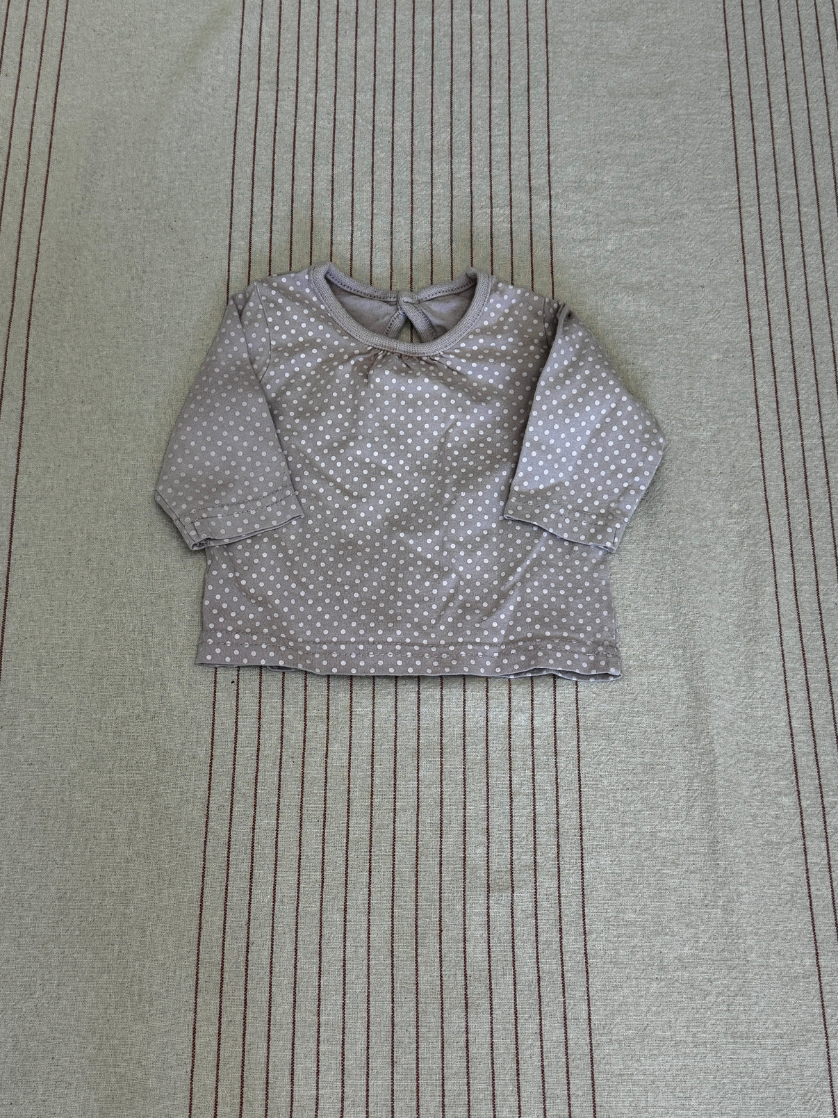 Roztomilé tričko s dlouhým rukávem v jemné šedé barvě s bílými puntíky od značky George. Toto tričko má elegantní detaily, jako je mašlička na zadní straně u krku, která dodává něžný vzhled. Díky příjemnému materiálu je ideální pro každodenní nošení, ať už doma nebo venku. Je vhodné pro holčičky ve velikosti 56 cm, ideální na první měsíce života. Praktické a stylové zároveň, tričko se snadno kombinuje s dalším dětským oblečením a poskytne pohodlí během celého dne.
