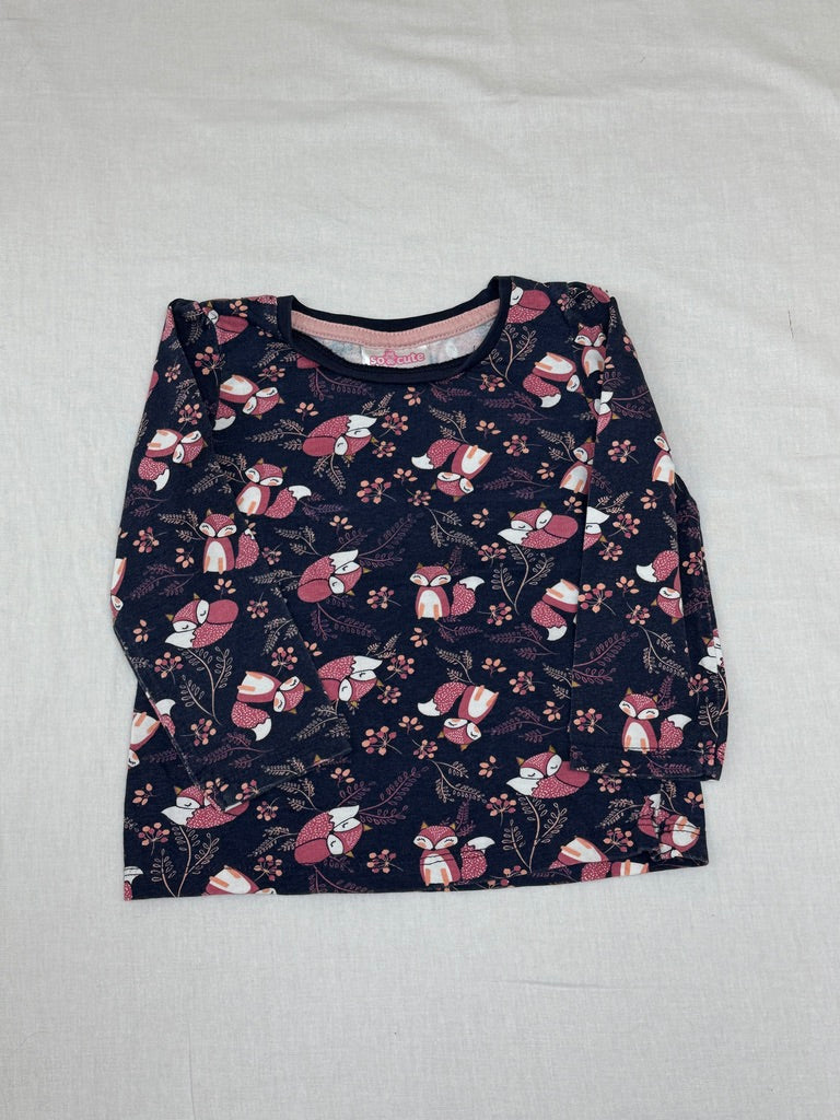 Triko s dlouhým rukávem značky Pepco ve velikosti 80. Má tmavě modrý podklad s roztomilým potiskem lištiček a květin v tlumených barvách. Je ideální na podzimní a zimní období, skvěle se hodí na každodenní nošení pro malé slečny.