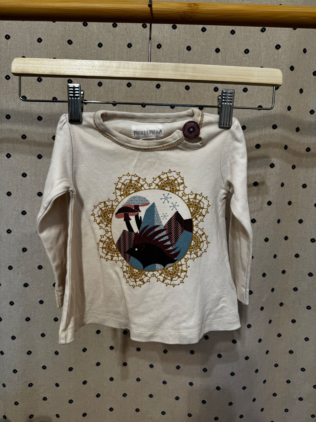 Krásné tričko s dlouhým rukávem pro holčičky ve velikosti 74 od značky Phister & Philina. Tričko je světle béžové s nádherným barevným potiskem lesních motivů na přední straně, který dodává kousku kouzelný vzhled. Elegantní zapínání na velký knoflík na rameni usnadňuje oblékání a svlékání. Tento kousek je vyroben z měkkého a pohodlného materiálu, ideální pro každodenní nošení a různé venkovní aktivity. Perfektní volba pro malé princezny, které milují stylové a pohodlné oblečení.