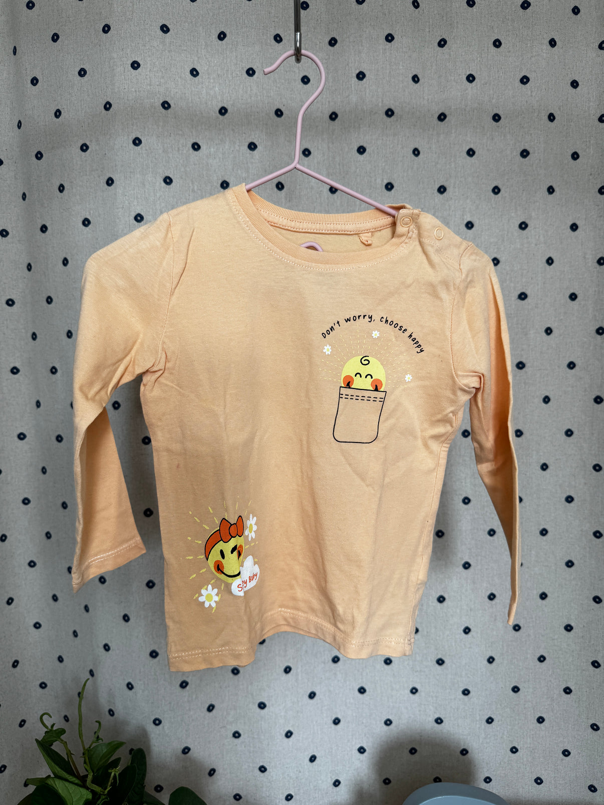 Veselé triko s dlouhým rukávem od značky Sinsay je skvělou volbou pro malé slečny, které chtějí být stylové a pohodlné. Toto triko ve velikosti 8 je v jemné broskvové barvě a je ozdobeno roztomilým potiskem usměvavé tvářičky s mašličkou a květinami. Nápis "Don't worry, choose happy" dodává optimistický nádech. Triko má praktické zapínání na rameni, což usnadňuje oblékání a svlékání. Vyrobeno z měkké a příjemné bavlny, která zajistí pohodlí po celý den. Perfektní pro každodenní nošení do školy, školky nebo na rodinné výlety.