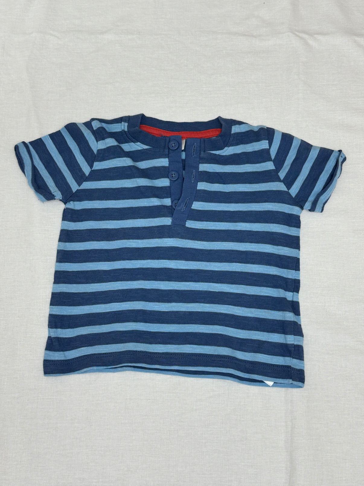Chlapecké tričko s krátkým rukávem od značky F&F ve velikosti 68 je skvělým kouskem pro teplejší dny. Tričko má stylový pruhovaný vzor v odstínech modré a je vyrobeno z příjemného a prodyšného materiálu, který zajišťuje komfort po celý den. Zapínání na knoflíčky u krku usnadňuje oblékání a dodává tričku moderní vzhled. Ideální pro běžné nošení doma i na procházky.