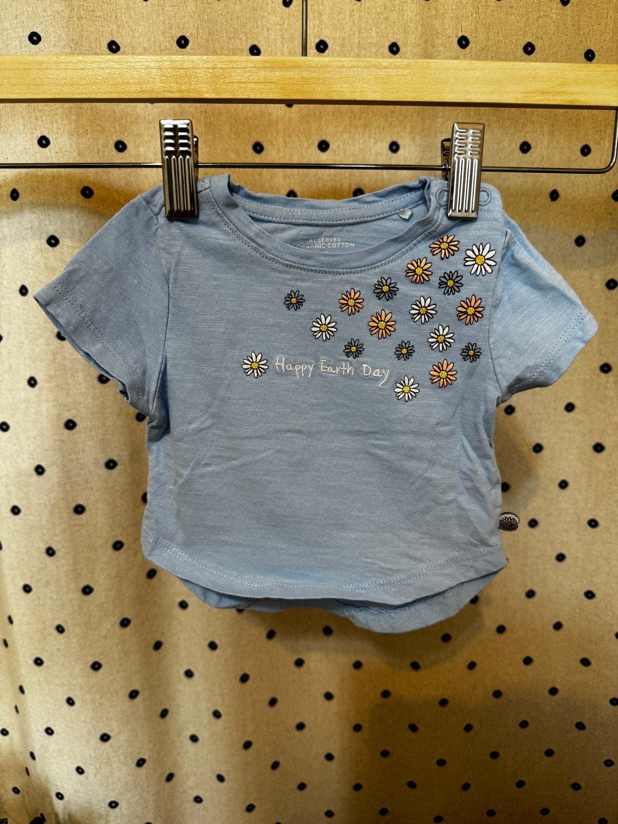 Modré triko s krátkým rukávem zdobené drobnými kvítky a nápisem "Happy Earth Day". Vyrobeno z organické bavlny, ideální na každodenní nošení. Velikost 62 pro holčičky.