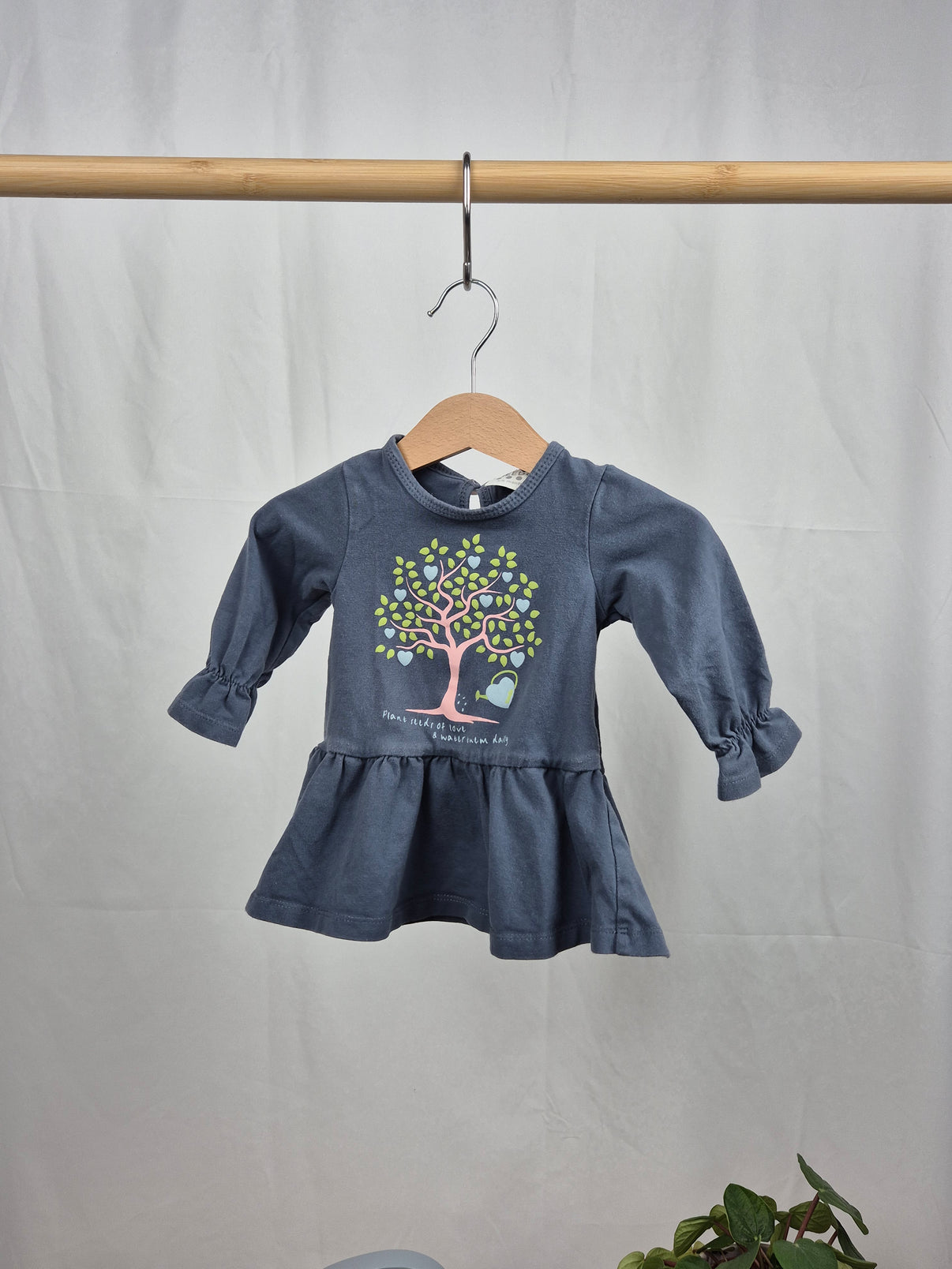 Roztomilá tunika s dlouhým rukávem v tmavě modrém odstínu zaujme potiskem stromu s jemnými detaily ve světlých barvách. Na hrudi najdeš milý nápis "Plant seeds of love & kindness", který dodává kousku pozitivní nádech. Nařasený střih ve spodní části a elastické zakončení rukávů dodávají tunice hravý vzhled a pohodlí při nošení. Měkký materiál je příjemný na dotek a ideální pro každodenní nošení, ať už doma, ve školce nebo na procházce. Skvělý kousek pro malé slečny, který snadno sladíš s legínami nebo punčocháči!