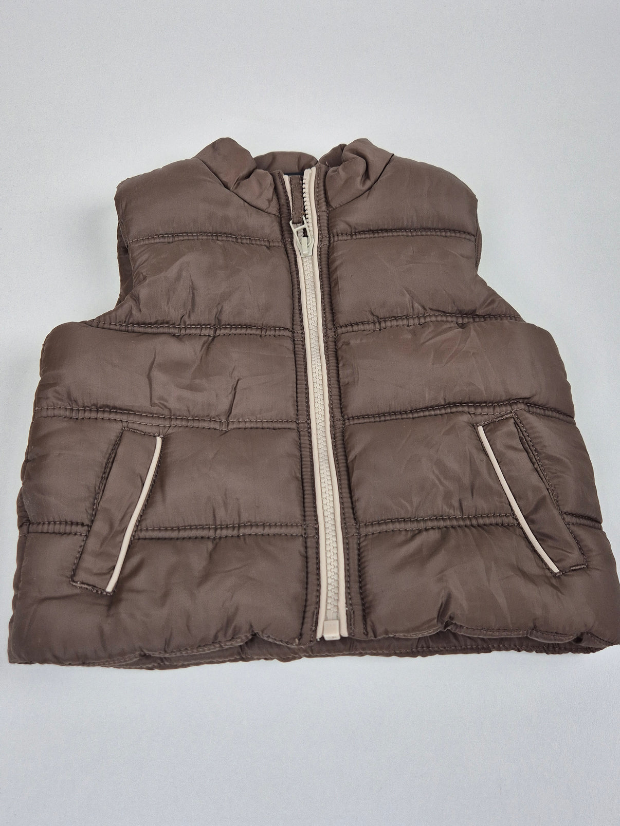 Tato dětská vesta značky Next ve velikosti 86 má hnědou barvu s prošíváním a zapínáním na zip v kontrastní béžové barvě. Po stranách jsou dvě praktické kapsy a uvnitř je příjemná fleecová podšívka, která udrží dítě v teple. Vesta je ideální na přechodné období – na podzim i jaro.