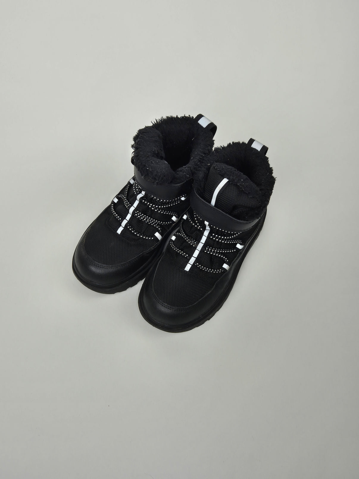 Stylová a funkční zateplená kotníková obuv H&M v elegantní černé barvě je skvělou volbou pro zimní období. Boty jsou vyrobené z kombinace odolného materiálu a textilu, který je doplněn o vnitřní hřejivý kožíšek, takže nožky zůstanou v teple i během mrazů. Díky praktickému suchému zipu a elastickým šňůrkám se snadno obouvají a dobře drží na noze. Robustní podrážka s hlubším vzorkem poskytuje jistý krok i na kluzkém povrchu.