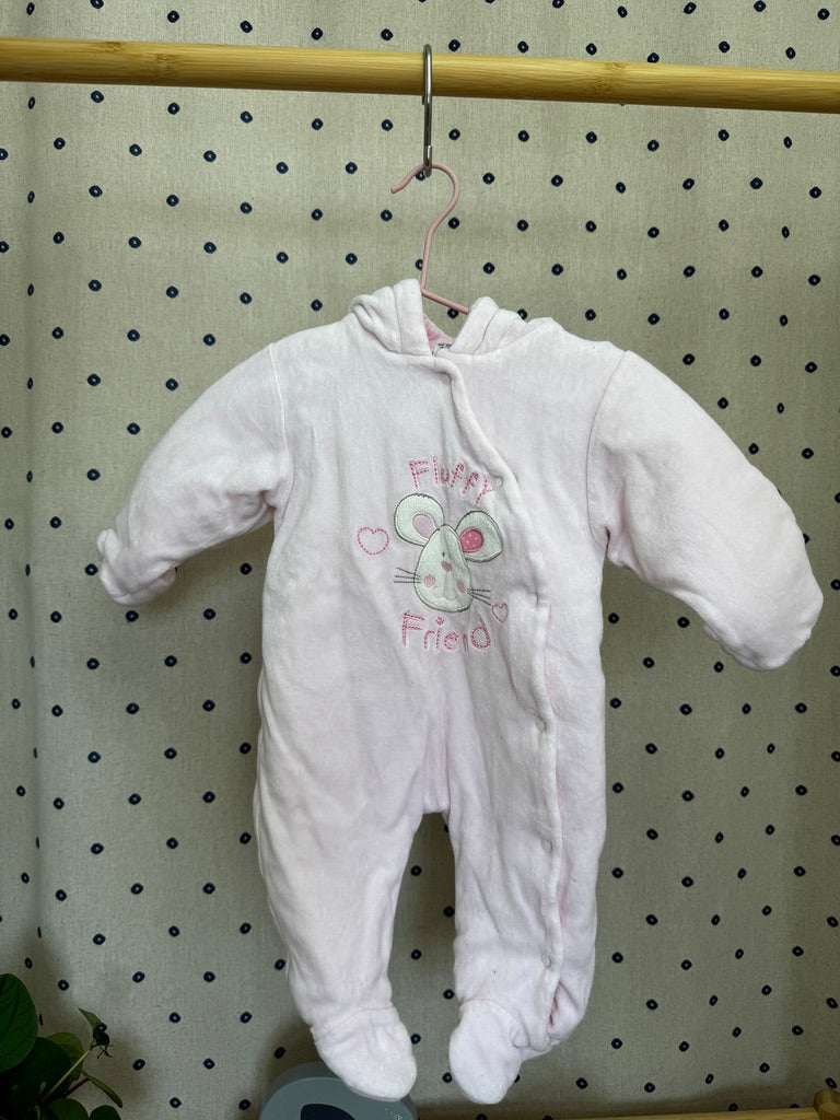 Růžový zateplený dětský overal M&Co ve velikosti 56/62 je ideální pro chladnější dny. Jeho měkký materiál a podšívka zajistí, že vaše děťátko bude v teple a pohodlí. Roztomilá výšivka s motivem myšky a nápisem "Fluffy Friend" dodává overalů hravý vzhled. Kapuce a uzavřené nožičky poskytují extra ochranu před chladem, což je perfektní volba pro venkovní procházky nebo cestování v kočárku.