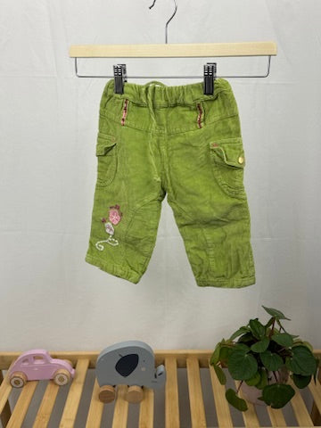 Roztomilé zelené manšestrové kalhoty jsou ideální volbou pro malé objevitele v chladnějších dnech. Jemný odstín zelené barvy je doplněn hravým vyšívaným motivem růžového motýlka, který dodává kalhotám něžný nádech.