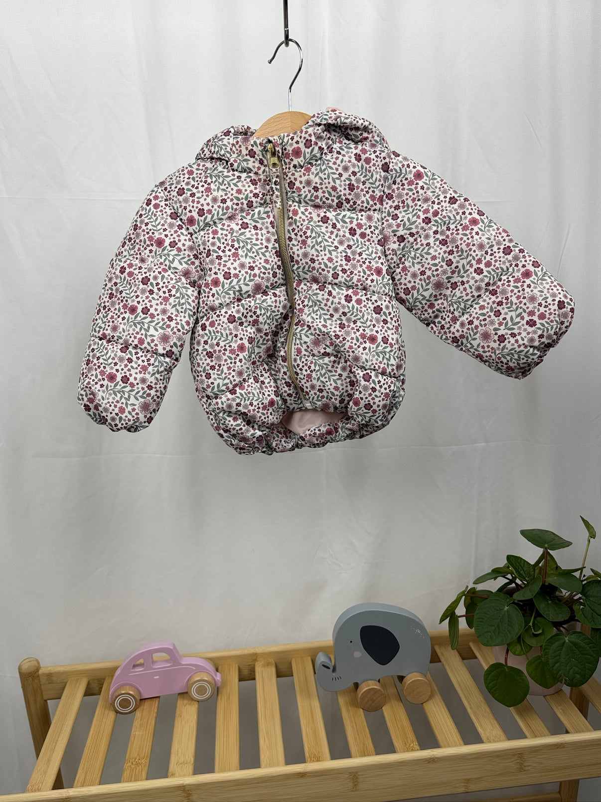 Růžová zimní bunda s květinovým potiskem od H&M, ve velikosti 74, je ideálním kouskem pro chladné dny. Tento stylový a funkční kousek poskytne Vaší malé slečně teplo a pohodlí. Kapuce nabízí extra ochranu před větrem, zatímco zapínání na zip usnadňuje oblékání. Květinový vzor dodává bundě hravý a roztomilý vzhled, který rozzáří každou zimní procházku.