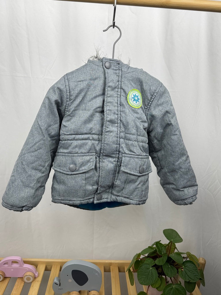 Praktická šedá zimní bunda značky Pepco ve velikosti 92, ideální pro chladné zimní dny. Bunda je zateplená, takže spolehlivě udrží teplo a ochrání před mrazem. Zapínání na zip a patentky usnadňuje oblékání a poskytuje dodatečnou ochranu proti větru. Velké přední kapsy s knoflíky jsou nejen stylové, ale i praktické. Na hrudi je ozdobný motiv se sněhovou vločkou, který dodává zimní nádech. Skvělá volba pro chlapečky i holčičky na procházky, zimní hry nebo cestu do školky.