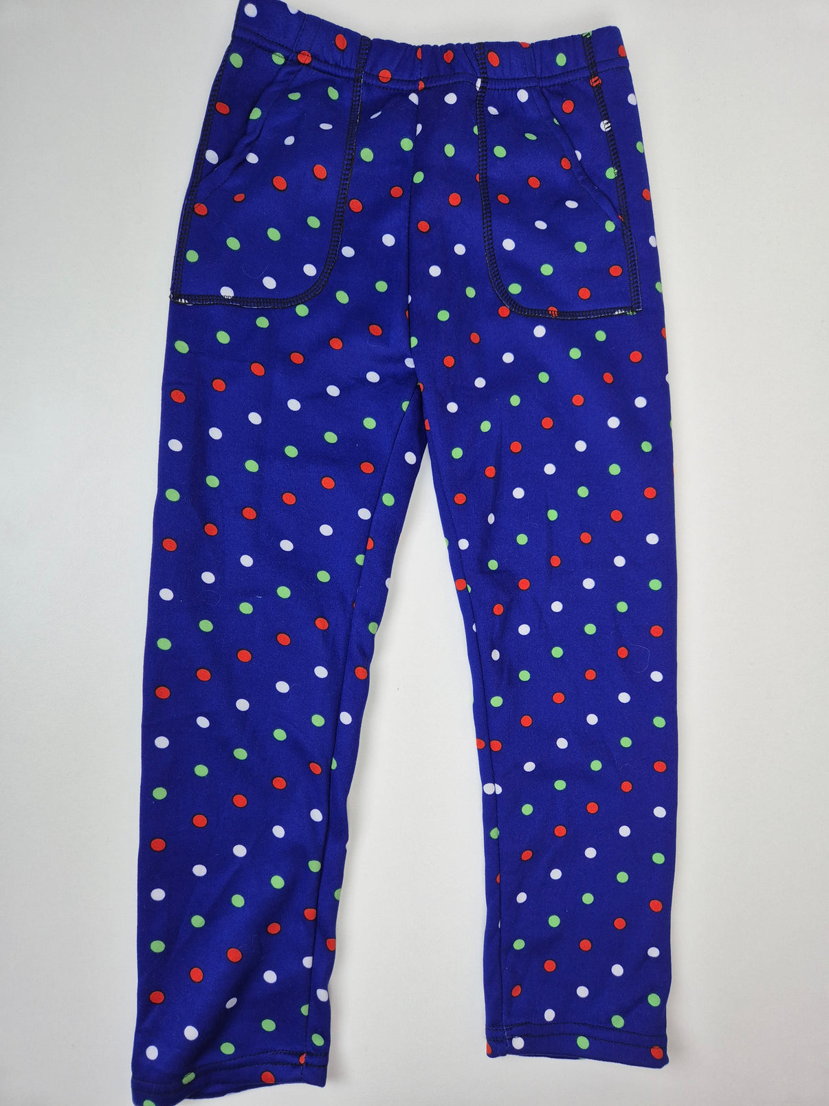 Veselé bambusové kalhoty WD Super v sytě modré barvě s celoplošným puntíkovým vzorem v červené, bílé a zelené. Díky bambusovému materiálu jsou mimořádně příjemné, prodyšné a vhodné na každodenní nošení – ideální do školy, školky i na doma. Kalhoty mají pohodlný elastický pas a praktické kapsy. Určeno pro holčičku.