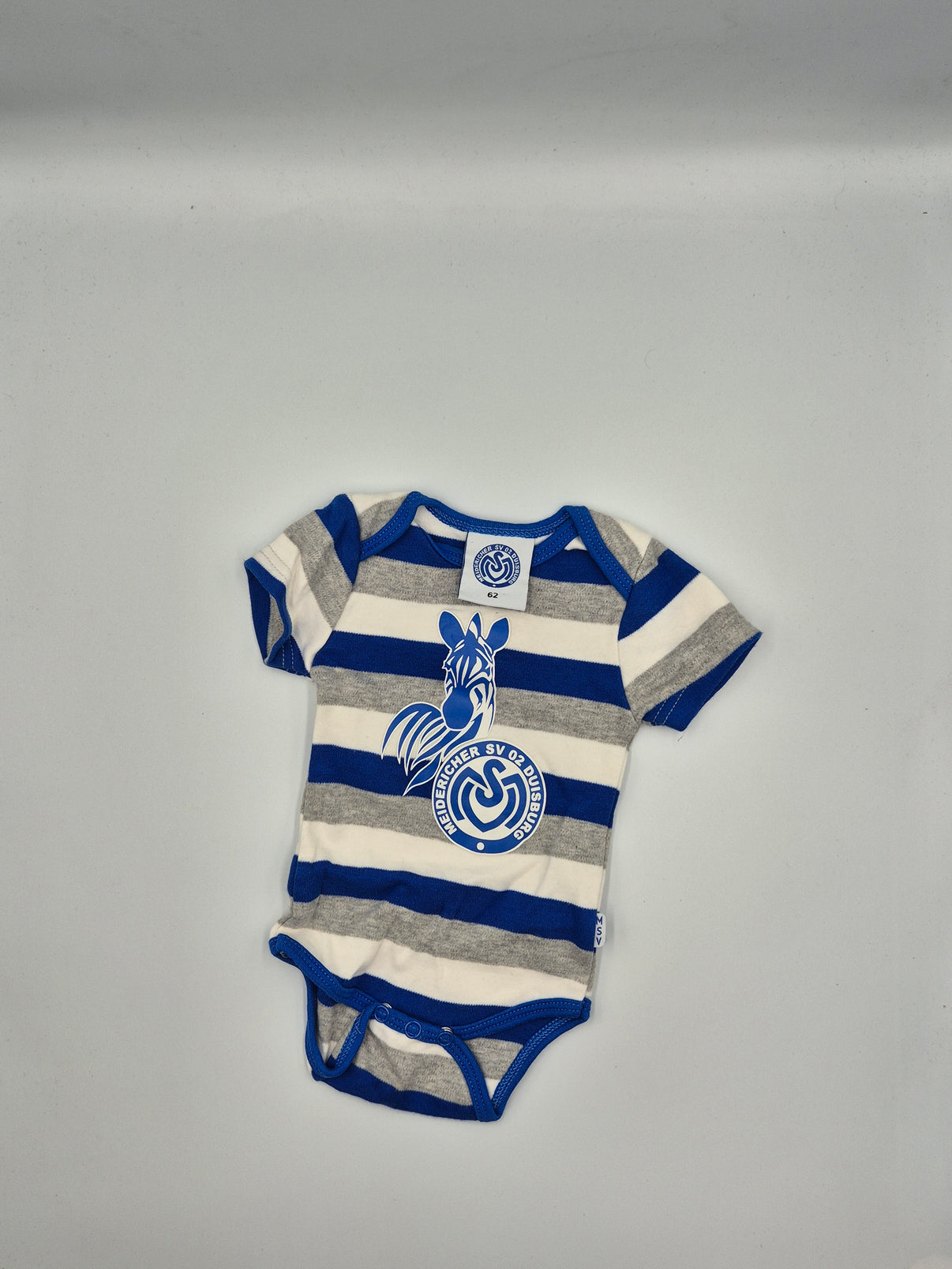 Kojenecké body v bílé barvě s výraznými pruhy v královsky modré a šedé zaujme sportovním vzhledem. Na přední straně je velký potisk zebry a logo německého fotbalového klubu MSV Duisburg, který dodává body originální fanouškovský styl.