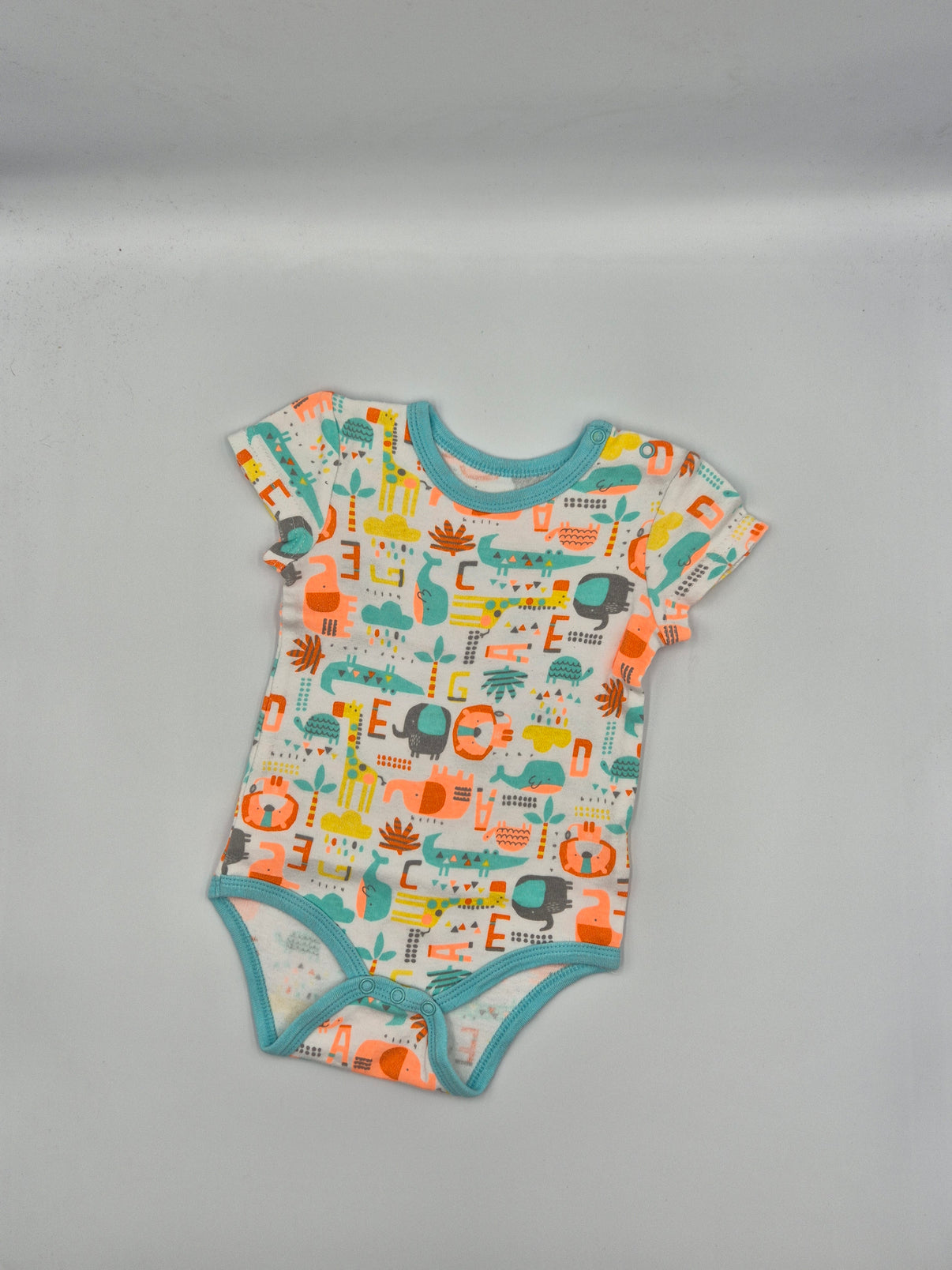 Body je bílé s veselým barevným potiskem zvířátek – najdete tu například žirafu, lva, slona nebo krokodýla doplněné o hravé tvary a písmenka v pastelových barvách. Lemování kolem krku a nohaviček je v jemné tyrkysové barvě, která hezky ladí s celkovým designem.