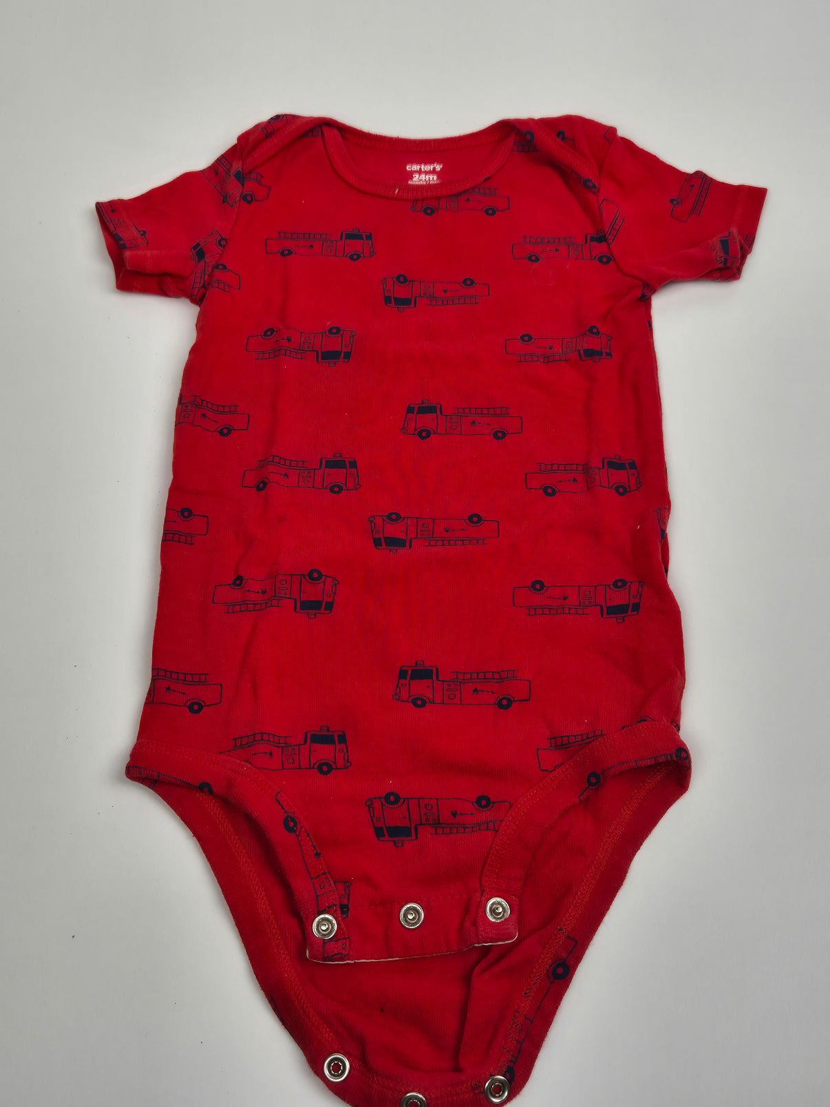 Kojenecké body Carter’s ve výrazné červené barvě s celoplošným potiskem hasičských aut. Měkký bavlněný materiál je příjemný na nošení a ideální pro každodenní dobrodružství. Krátké rukávy se hodí do teplejších dnů nebo jako spodní vrstva, zapínání na patentky mezi nožičkami usnadní přebalování. Oblíbený motiv potěší hlavně malé kluky, ale klidně udělá radost i každému malému milovníkovi aut.